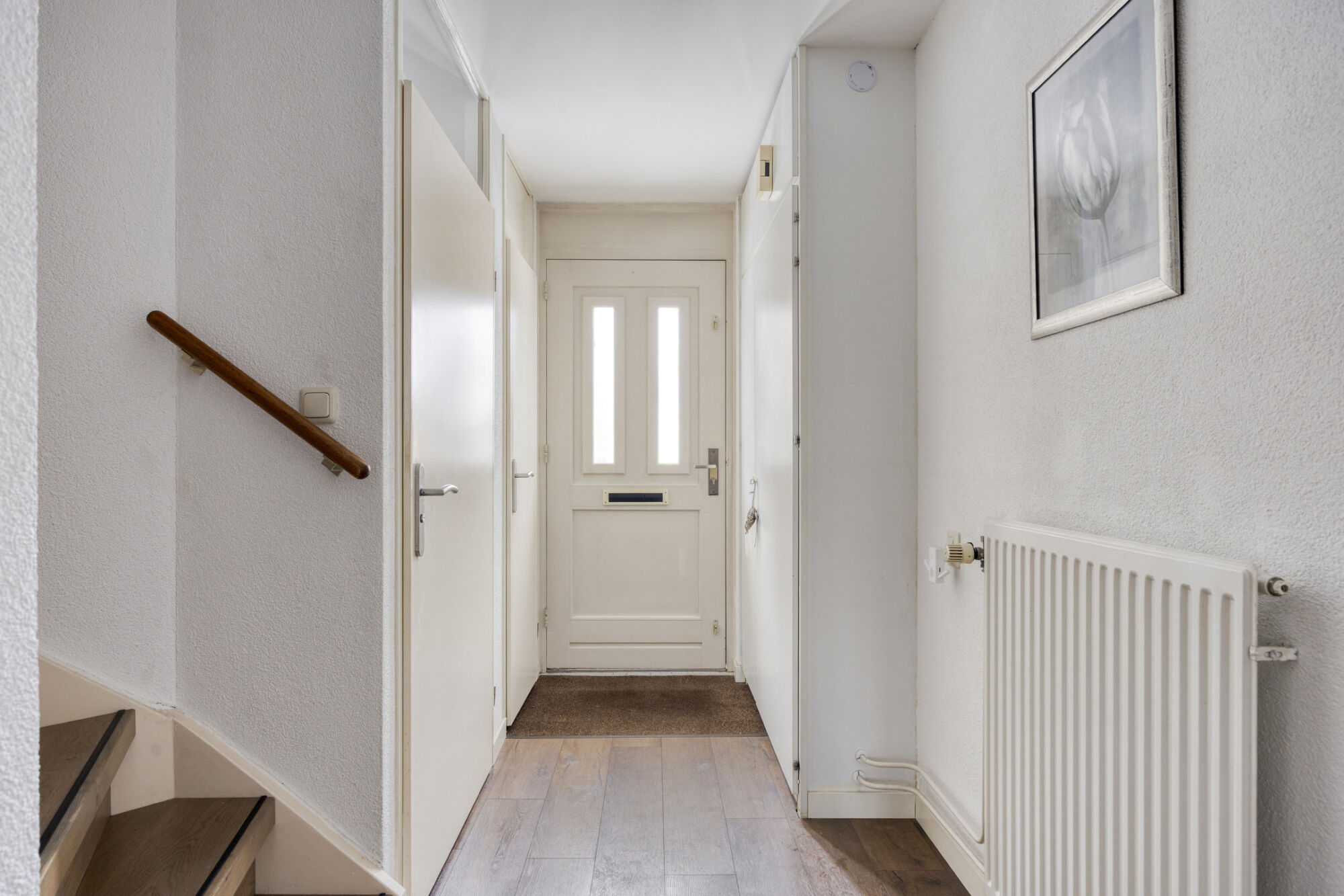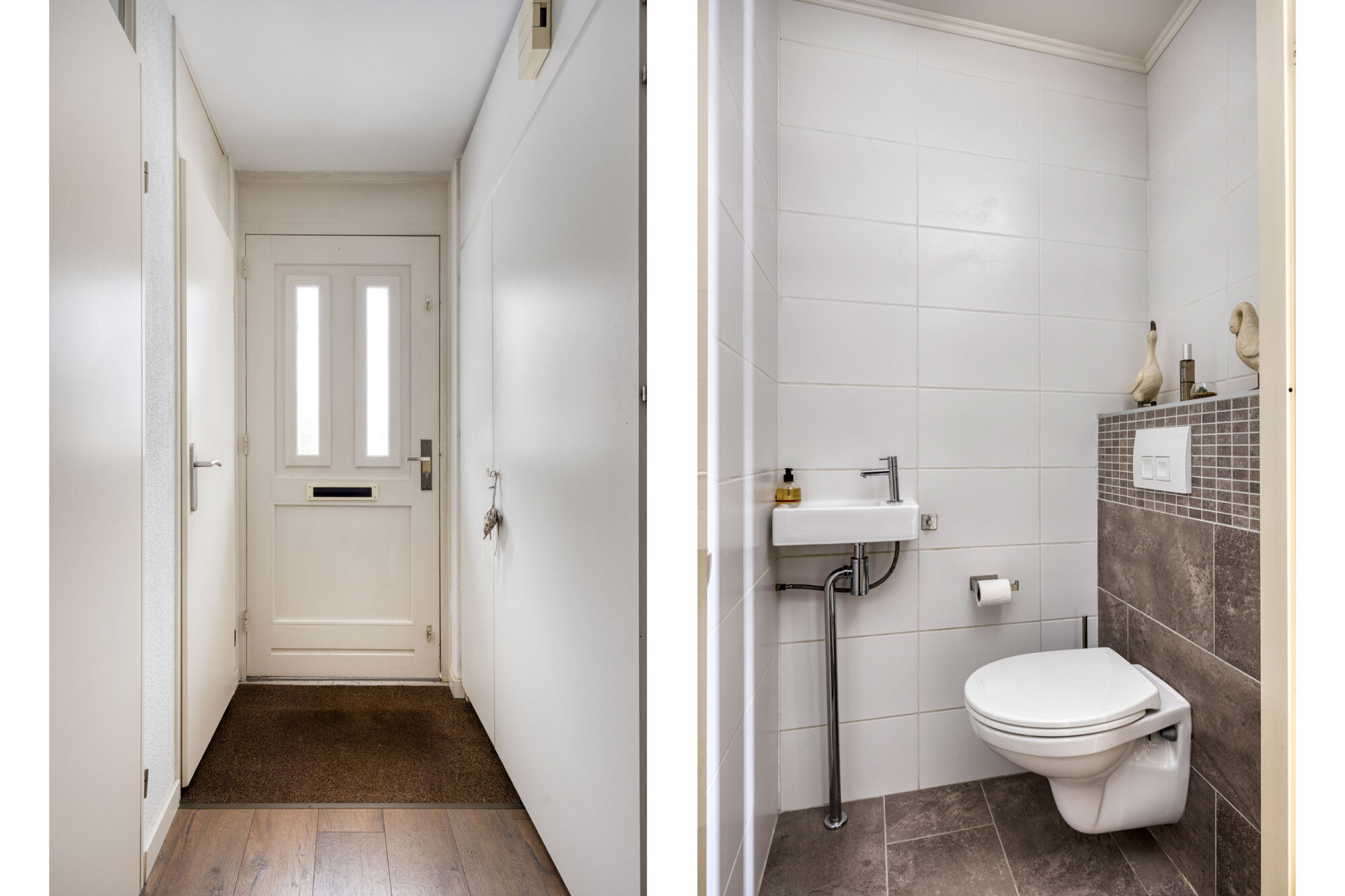 Entree/hal voorzien van een stijlvolle hout-look laminaatvloer met toegang tot de meterkast en het volledig betegelde toilet. Het toilet is netjes afgewerkt en voorzien van een fonteintje.