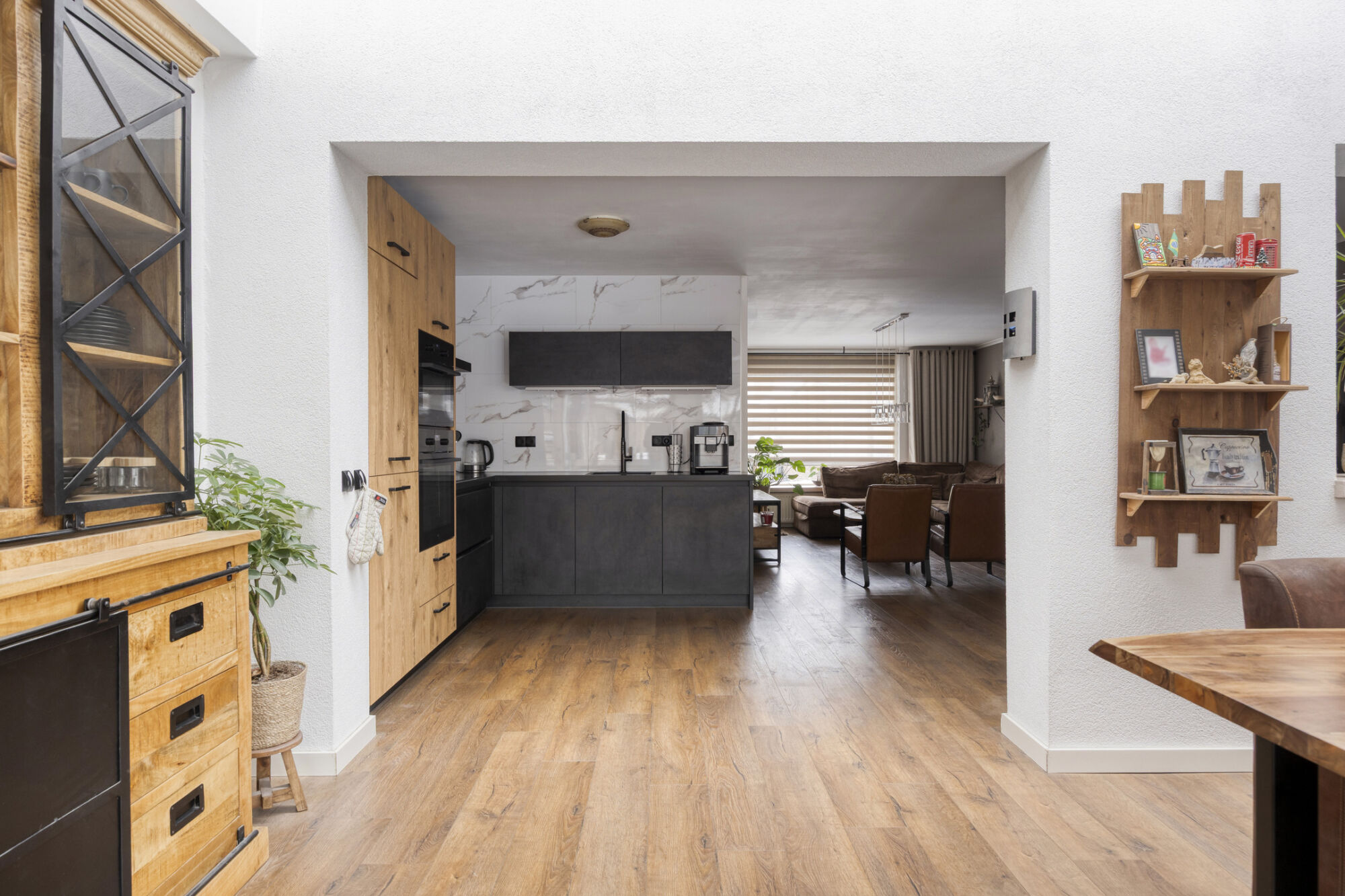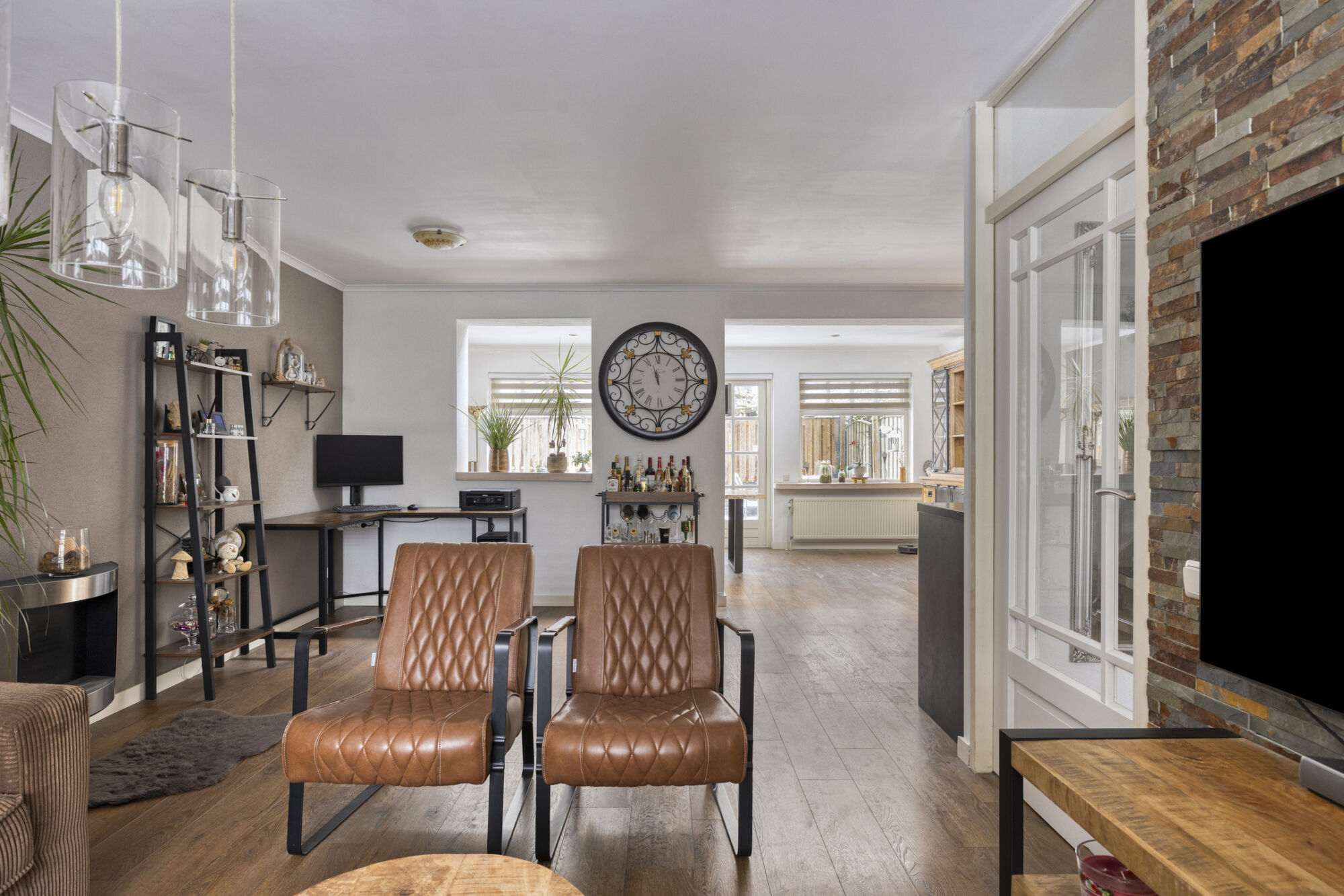 Zodra u de woonkamer binnenstapt, valt direct de overvloed aan daglicht op. Dankzij de over de volledige breedte gerealiseerde aanbouw aan de achterzijde is de woonkamer aanzienlijk vergroot, waardoor er volop ruimte is voor zowel een gezellige zithoek als een royale eetkamer. De twee leefruimtes staan in open verbinding met elkaar, maar bieden tegelijkertijd de mogelijkheid om een gevoel van privacy te behouden.