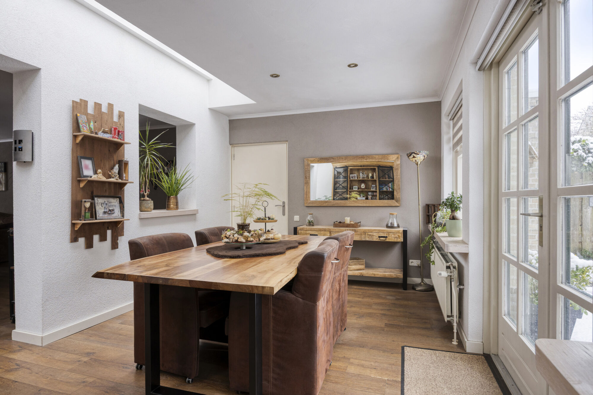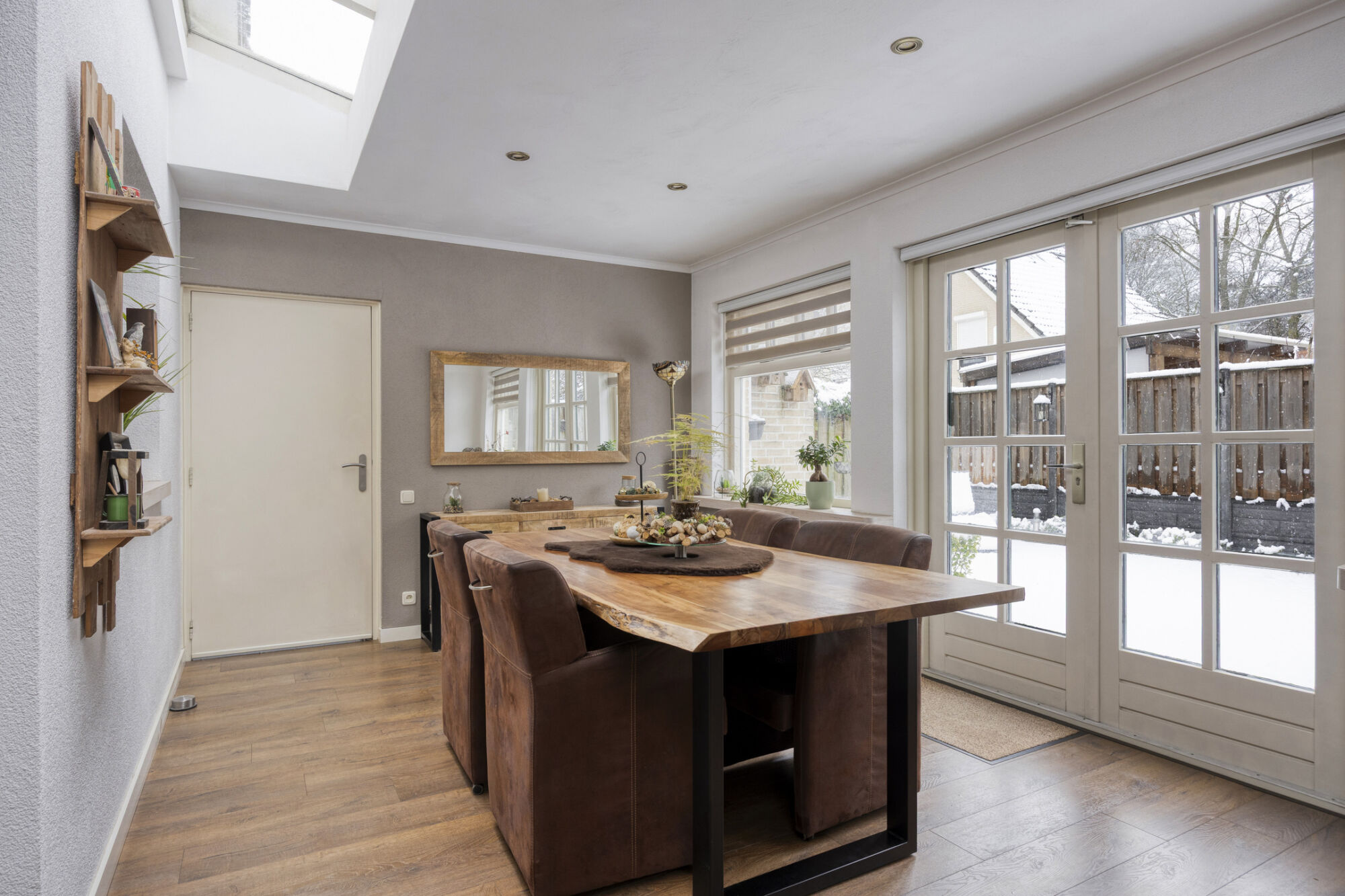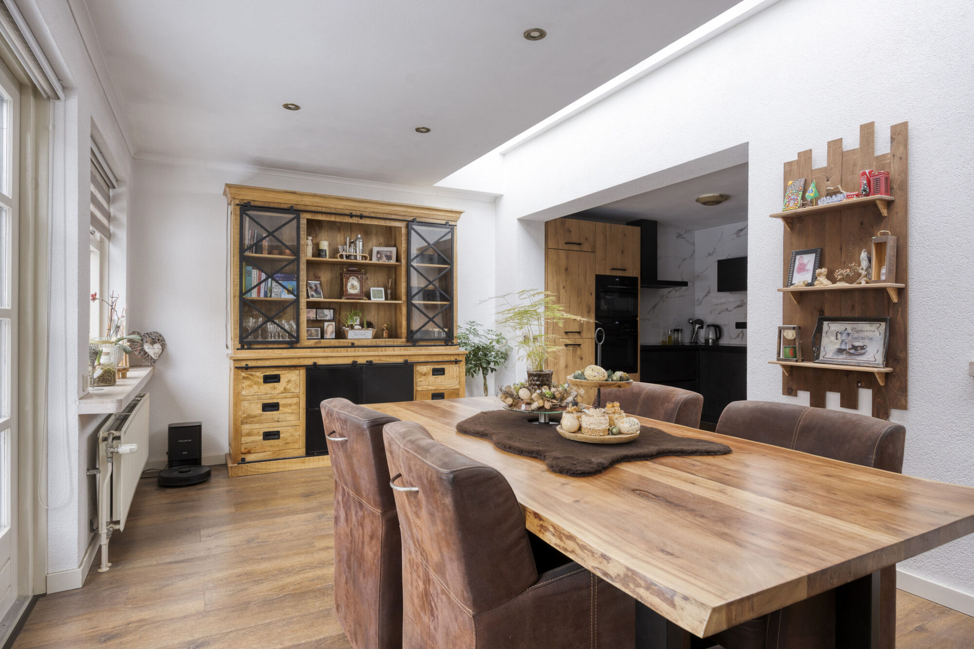 De lichtstraat in de aanbouw zorgt voor extra lichtinval en versterkt het aangename karakter van deze leefruimte. Via de openslaande tuindeuren wordt de woonkamer verbonden met de tuin.