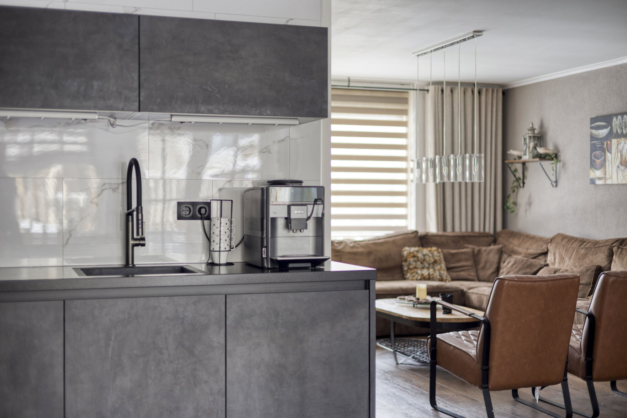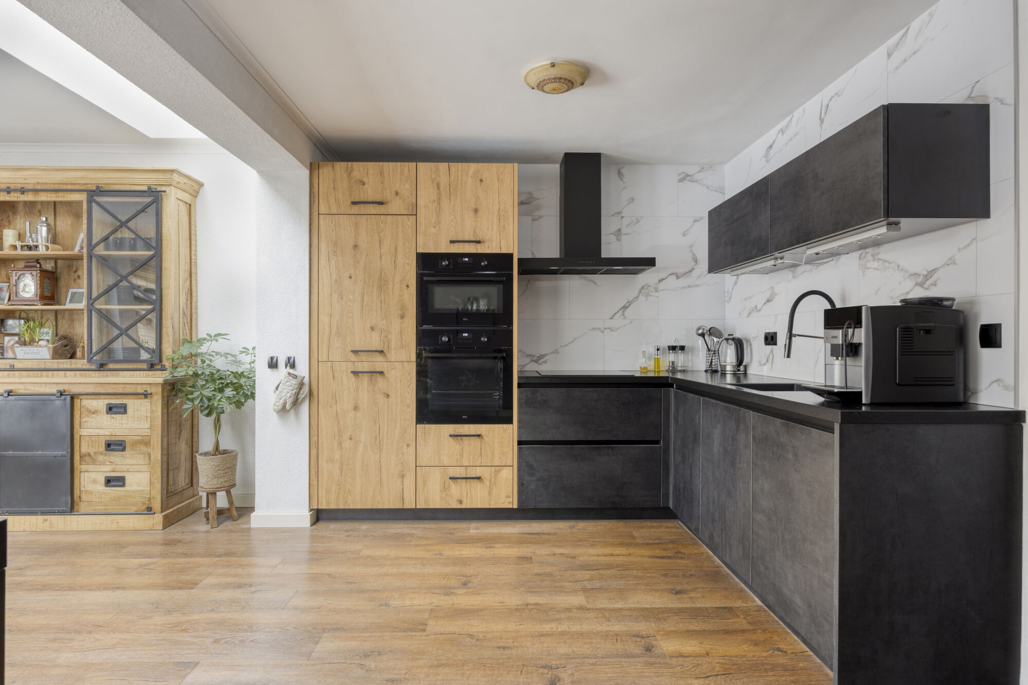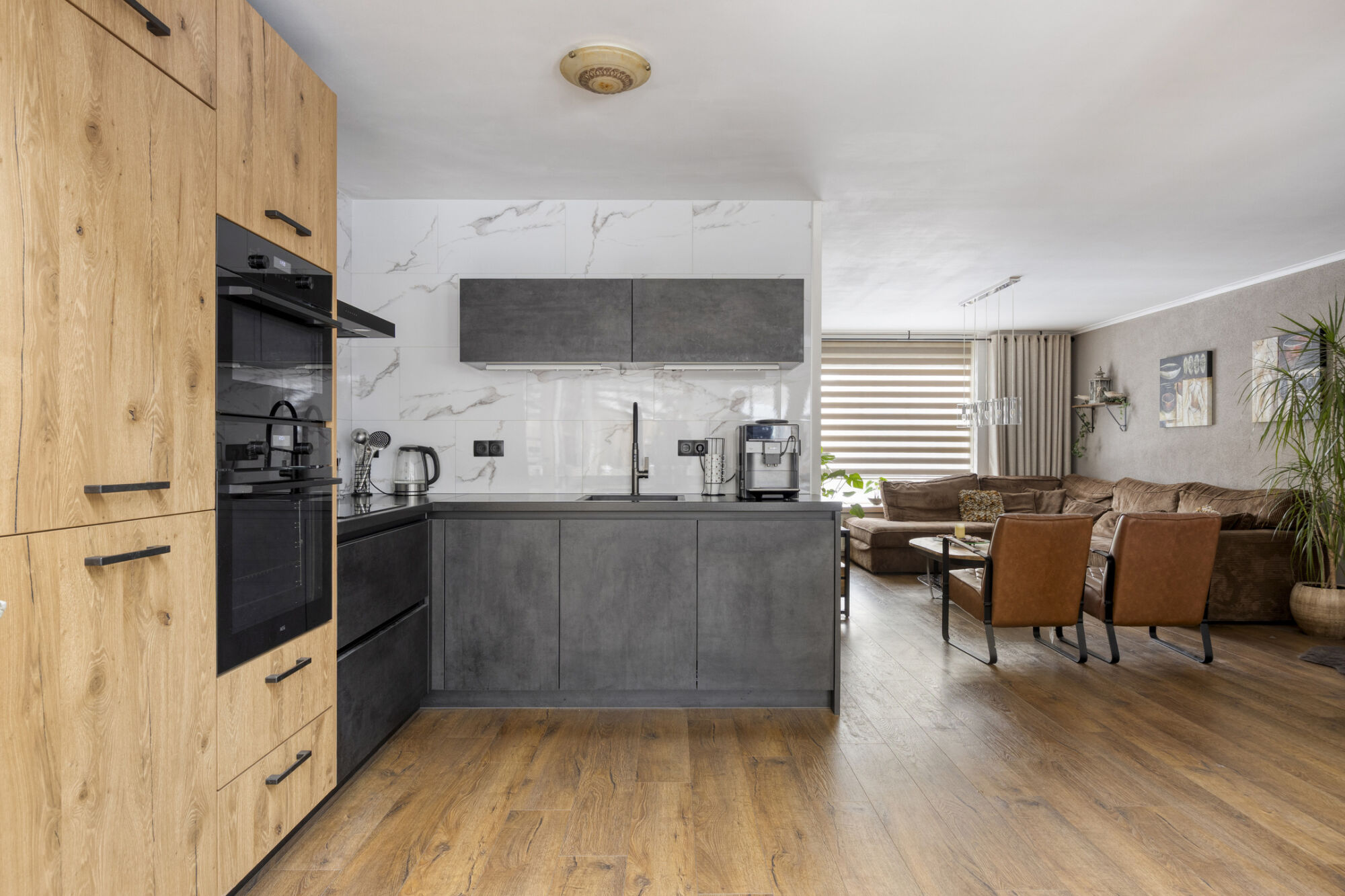 De keuken beschikt over een complete set inbouwapparatuur, waaronder een combi-magnetron, oven, inductiekookplaat, afzuigkap, koelkast, vriezer, vaatwasser en een spoelbak met een RVS flexibele mengkraan.