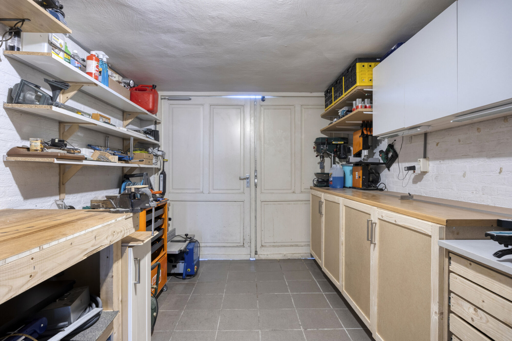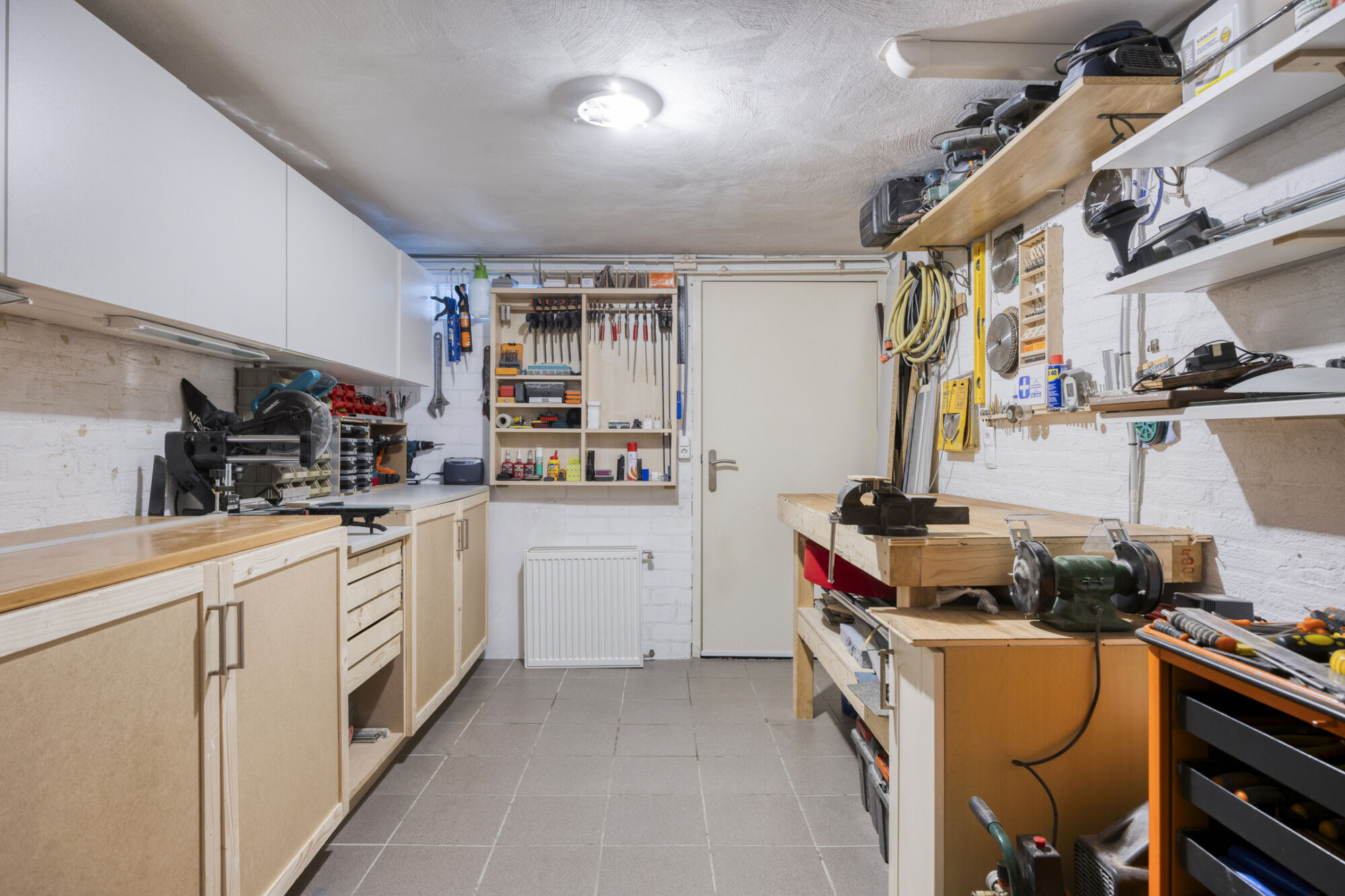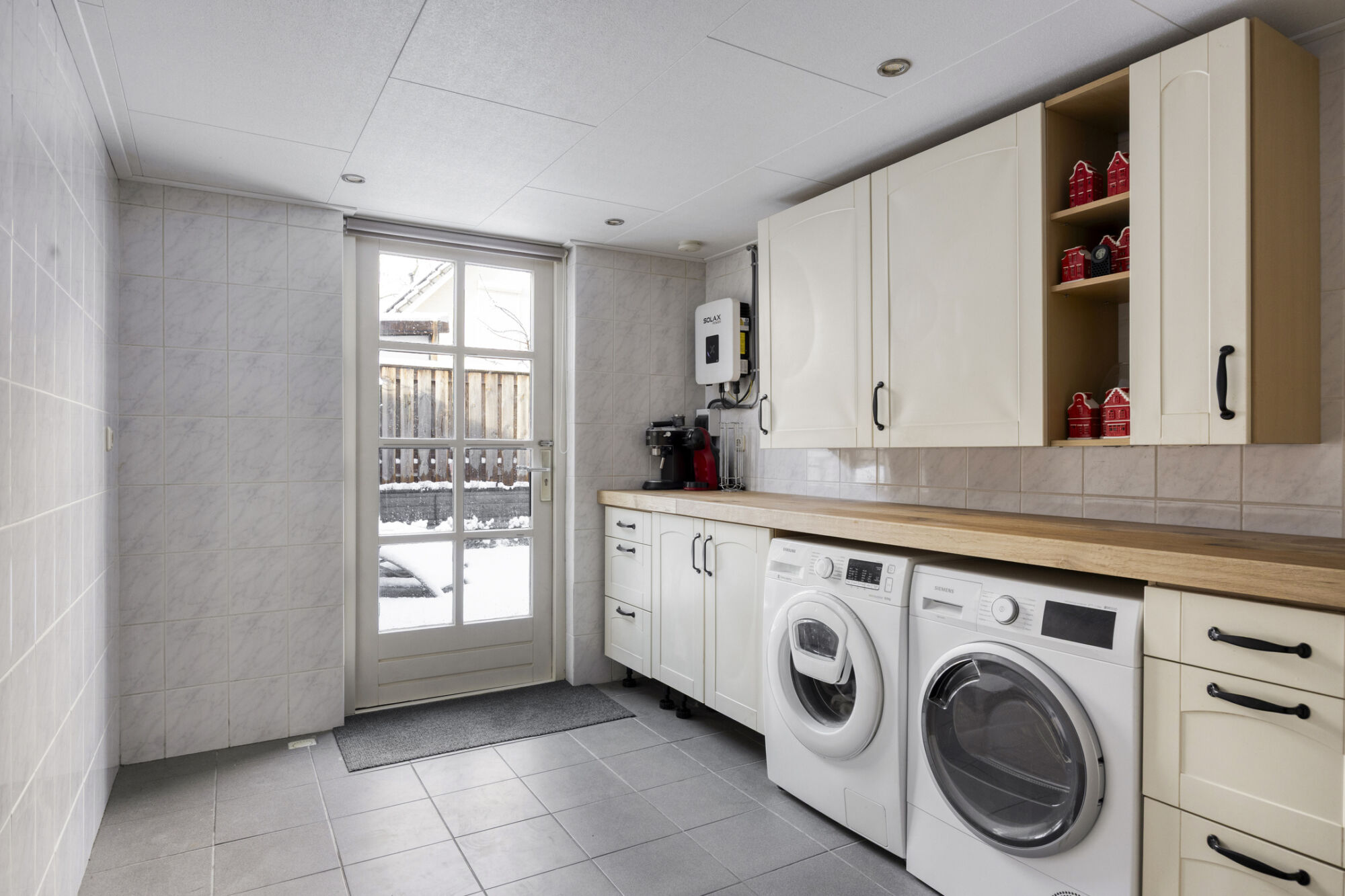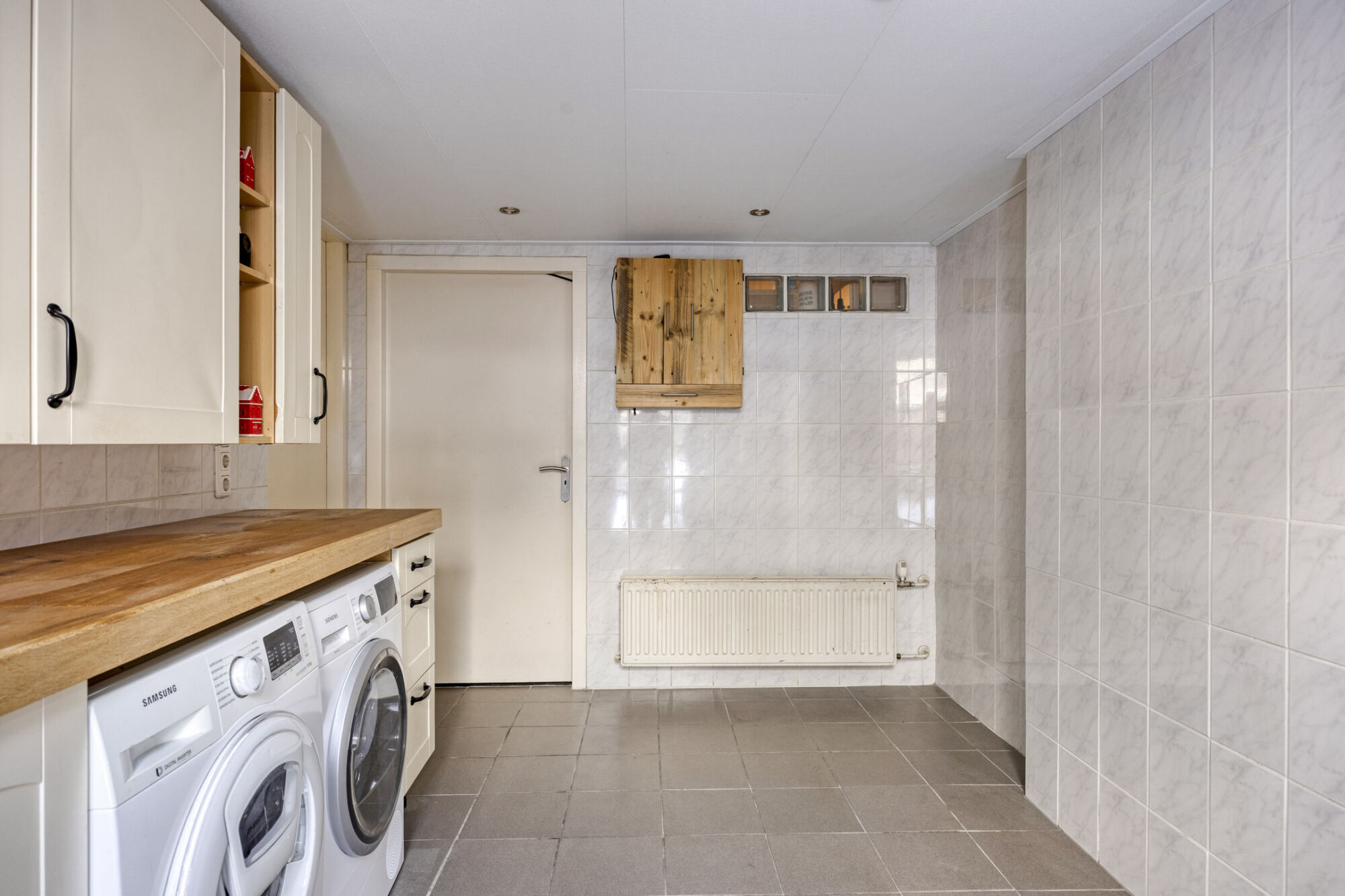 Vanuit de eetkamer is er een praktische doorgang naar de bijkeuken. Deze ruimte is afgesloten van de woonkamer en vormt een ideale plek voor de wasmachine en droger, met daarnaast voldoende ruimte voor een extra koelkast en/of vriezer. Het aanwezige keukenblok biedt extra opbergmogelijkheden voor dagelijkse spullen. De bijkeuken is volledig betegeld en uitgevoerd als een droge, verwarmde en goed geïsoleerde ruimte, wat zorgt voor optimaal comfort en gebruiksgemak.
