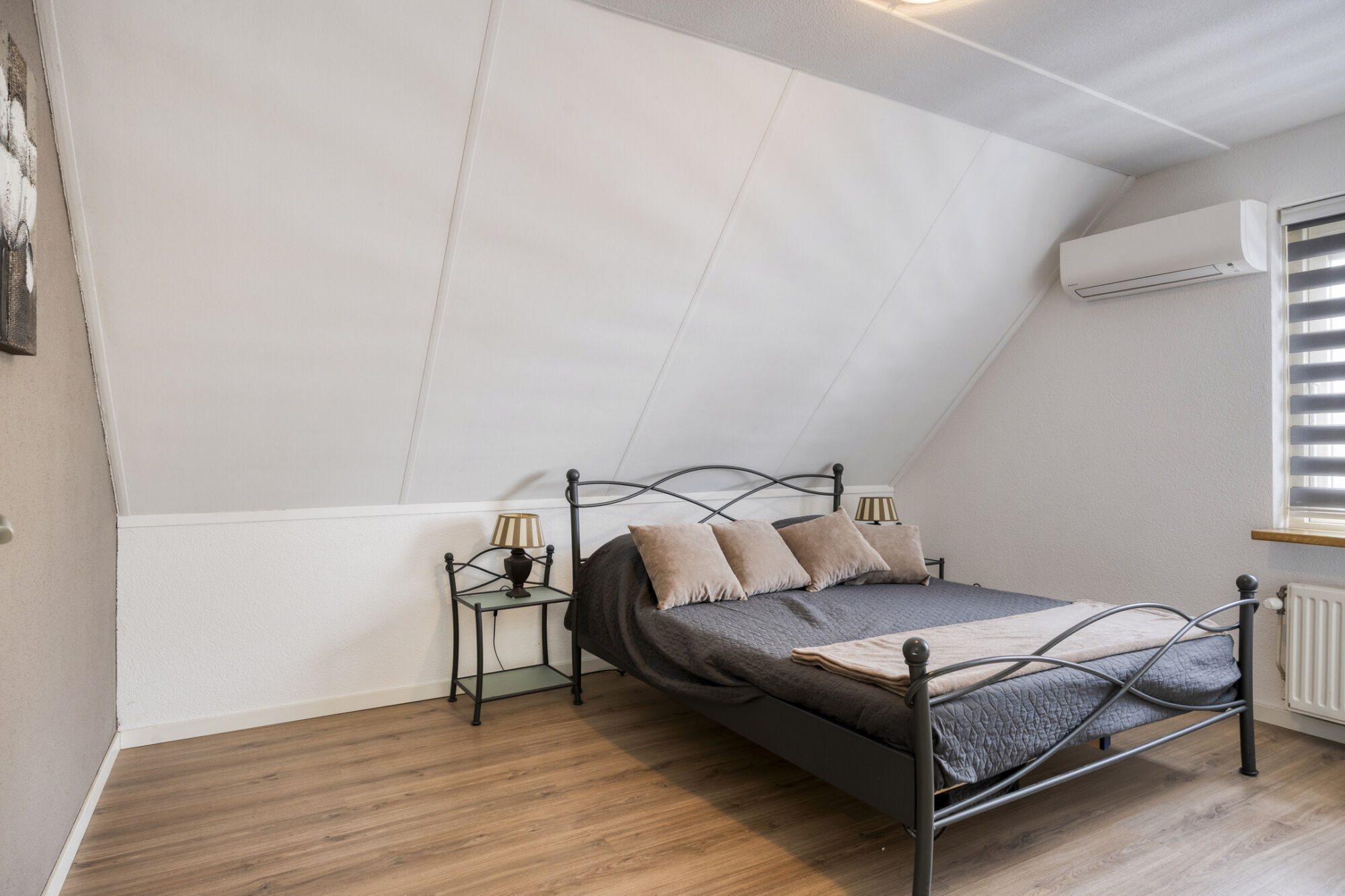De eerste verdieping beschikt over drie slaapkamers. De royale hoofdslaapkamer biedt meer dan voldoende ruimte voor een groot tweepersoonsbed met bijpassende nachtkastjes en is bovendien voorzien van airconditioning.