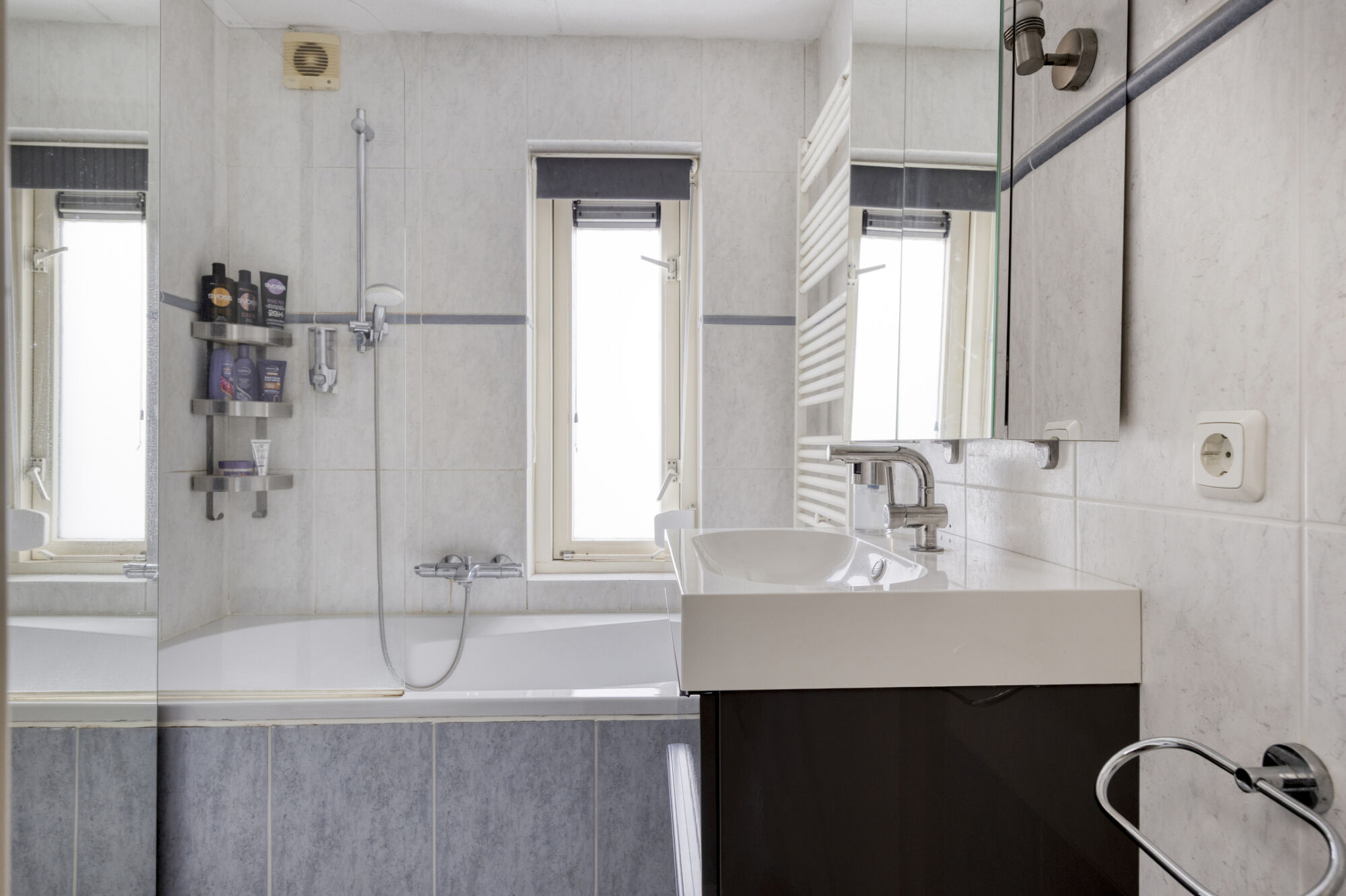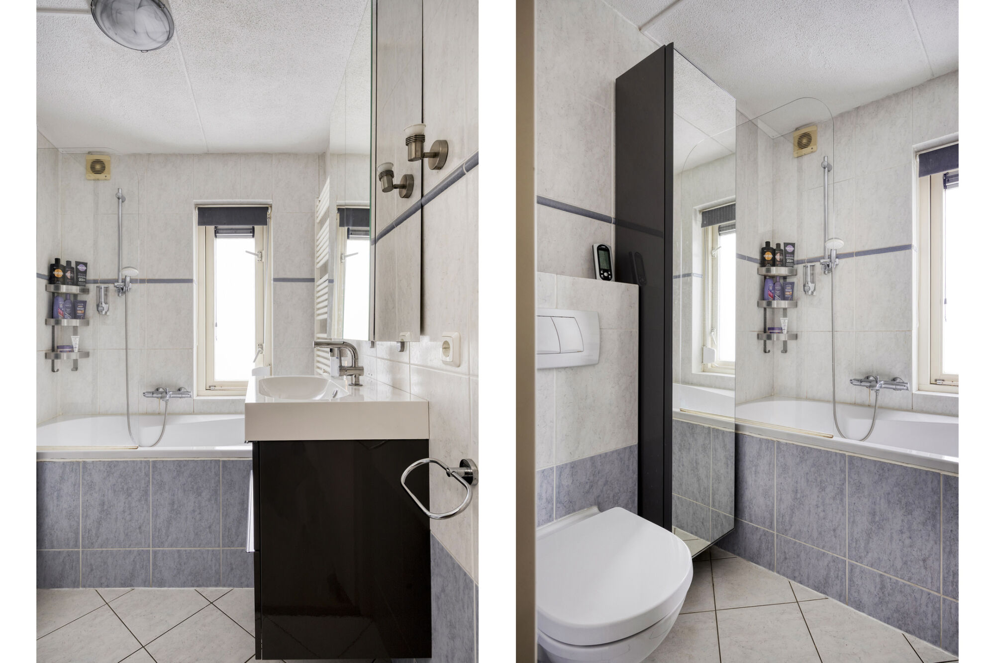 Het sanitair bestaat uit een ligbad met douchefunctie, een wastafel met meubel, een toilet en een handdoekradiator. Daarnaast is de badkamer uitgerust met mechanische ventilatie en kan het raam uiteraard ook worden geopend voor extra ventilatie.