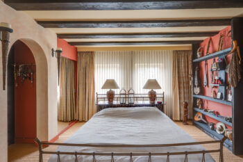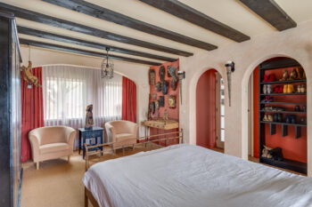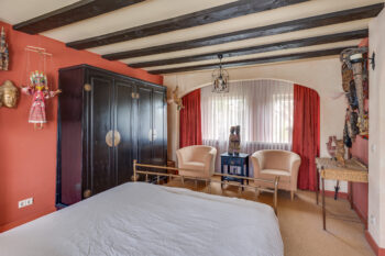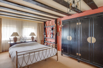 De master-bedroom is van zeer ruim formaat. Orgineel waren dit 2 slaapkamers. Hier kunt u met gemak uw gewenste meubilair kwijt. De kamer is afgewerkt in een klassieke stijl, zo zijn er plafondbalken in het zicht en is er aan de achterzijde een boog te vinden. De andere slaapkamer wordt momenteel gebruikt als garderobekamer, maar zou natuurlijk als slaapkamer, maar bijvoorbeeld ook als thuiswerkplek gebruikt kunnen worden. Een laminaatvloer en stucwerk zorgen hier voor een strak geheel. Beide kamers zijn voorzien van inbouwkasten.