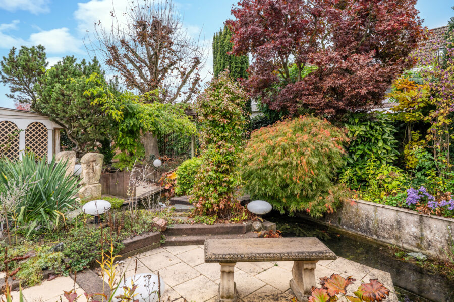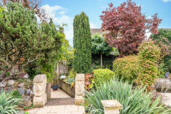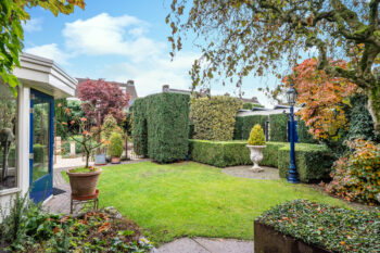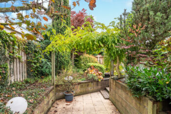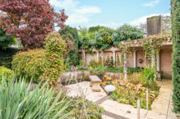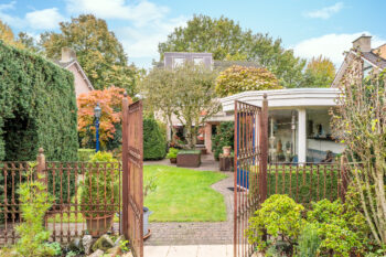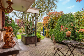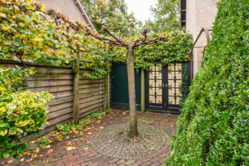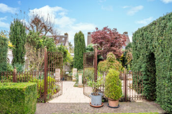 Vanuit het portaal aan de achterzijde van de woning loop je je eigen paradijs binnen. Gemeten vanaf de achtergevel van de woonkamer is deze tuin maar liefst ca. 24 meter diep! Het voorste gedeelte is een mix van bestrating, plantenperken en gras, waardoor er ruimte is voor het plaatsen van uw tuinmeubilair in een ontzettend rustgevende omgeving. Aan de achterzijde – achter de sierlijke poorten – vind je een paradijselijke opstelling van zorgvuldig samengestelde paden, planten, bomen en overige tuinaankledingen. Wat een uitzicht!
