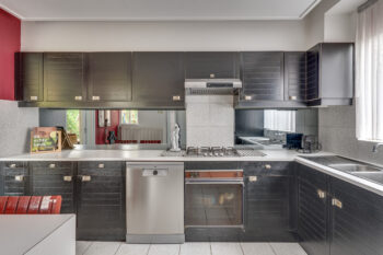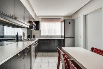 Vanuit de woonkamer komt je in de keuken. Door de schuifdeur die deze ruimtes scheidt kan er optimaal gebruik gemaakt worden van beide kamers. Hier tref je in een enorme hoeveelheid berg- en werkruimte, in een hoekopstelling geplaatst. Het lichte, stenen werkblad en de klassieke, zwarte fronten zorgen voor een tijdloos geheel. Naast dat deze keuken groot genoeg is voor het plaatsen van een eettafel vind je hier ook de volgende (inbouw)apparatuur: