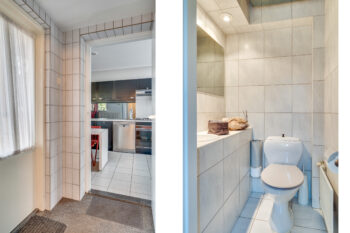 In het verlengde van de keuken vind je een portaal dat je toegang geeft tot de achtertuin, het toilet en de bijkeuken. Het toilet is in witte kleur betegeld, met een ingebouwde wasbak, een grote spiegel en een vrijstaand toilet.