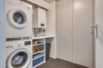 De bijkeuken is de ideale multifunctionele ruimte. De witgoedaansluitingen en de C.V.-ketel zijn verwerkt in een praktische open kast, ideaal voor opslag van de huishoudelijke spullen. Ook is hier een grote inbouwkast te vinden, perfect om grotere schoonmaakbenodigdheden of bijvoorbeeld sporttassen in op te bergen. De C.V.-ketel is nog geen jaar oud, dus hier heb je nog jaren plezier van!