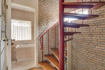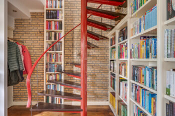 Via de wenteltrap in de hal kom je op de overloop van de eerste verdieping. Van beneden tot boven is een fraaie verticale boekenkastenwand aangebracht. Vanuit de overloop heb je toegang tot de twee slaapkamers op de eerste verdieping, de badkamer en de trapopgang naar de tweede verdieping.