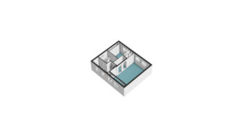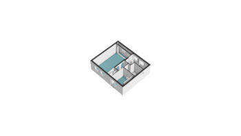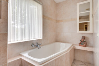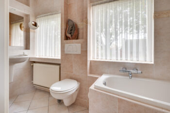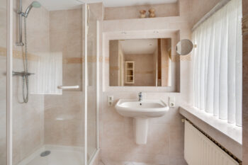 De badkamer is aan de voorzijde van de woning gelegen. De vloeren en wanden zijn betegeld in een lichte kleur met een iets donkerdere sierstrip. Hier vind je een douchecabine, een ligbad, een hangtoilet en een wastafel.