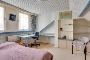 De ruimte in deze slaapkamer wordt optimaal benut door de aanwezigheid van de dakkapel. Hierdoor wordt er flink wat ruimte gewonnen en heb je meer dan genoeg ruimte om het gewenste meubilair voor een tweepersoonsinrichting te plaatsen. De inbouwkasten maken de ruimte af.