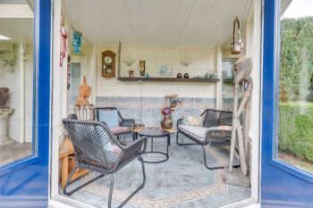 Kom je thuis van een lange dag werken, of wil je gewoonweg ongestoord even genieten van je eigen tuin? Neem dan plaats in het theehuis. Deze stijlvol – in Mediterraanse stijl – betegelde ruimte is voorzien van raampartijen rondom zodat je het rustgevende gevoel dat de achtertuin uitstraalt ook hier perfect ervaart!