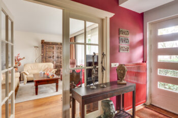 Bij aankomst parkeer je jouw auto op de ruime oprit, gedeeltelijk overdekt door een carport met toegang tot de garage. Via een verzorgde voortuin loop je richting de voordeur van deze charmante jaren ’70 woning. Je komt de woning binnen in een royale hal, voorzien van een wenteltrapopgang naar de eerste verdieping, de meterkast, een aantal kasten. Je treft hier een klassieke afwerking met een houten vloer en gemetselde wanden.