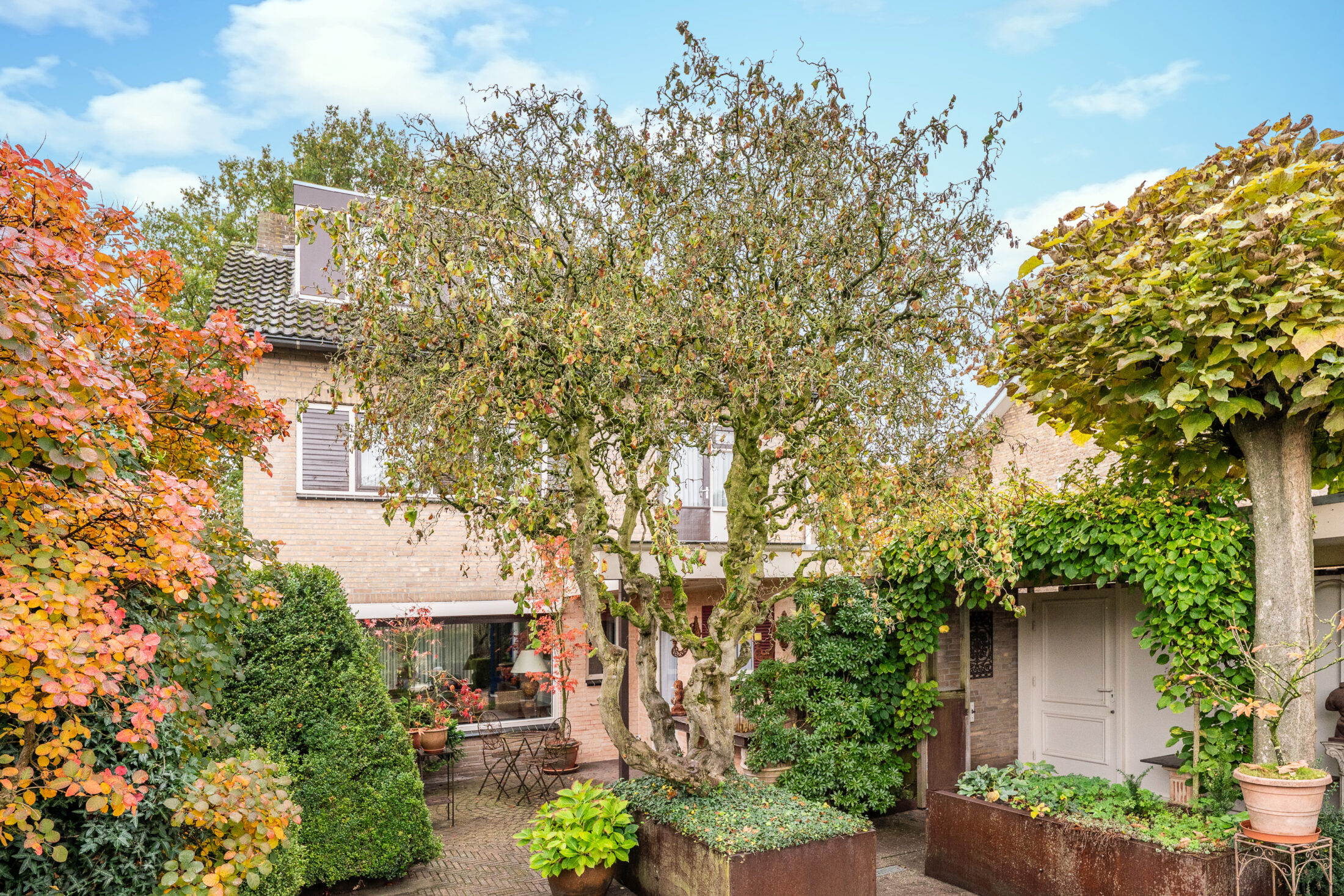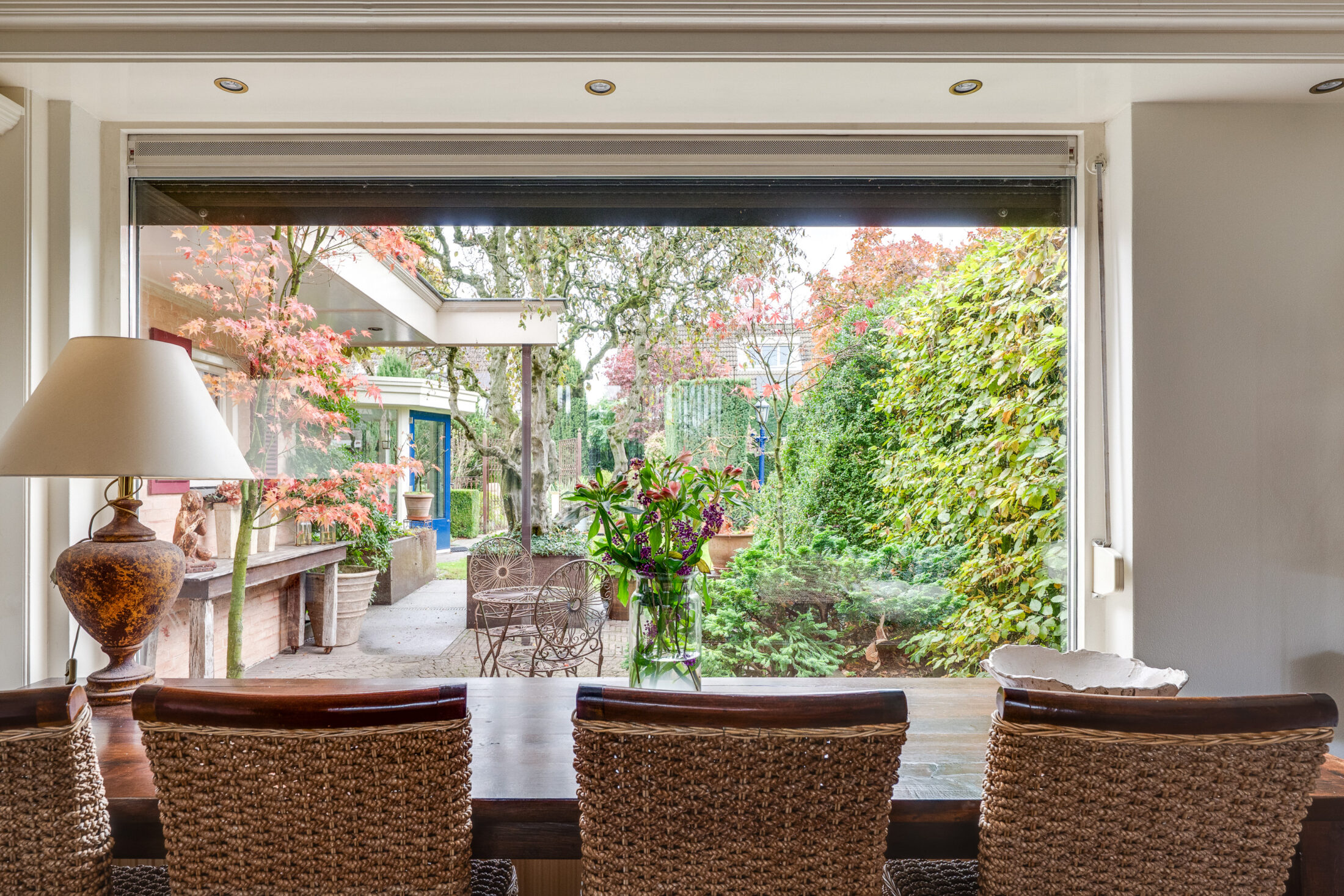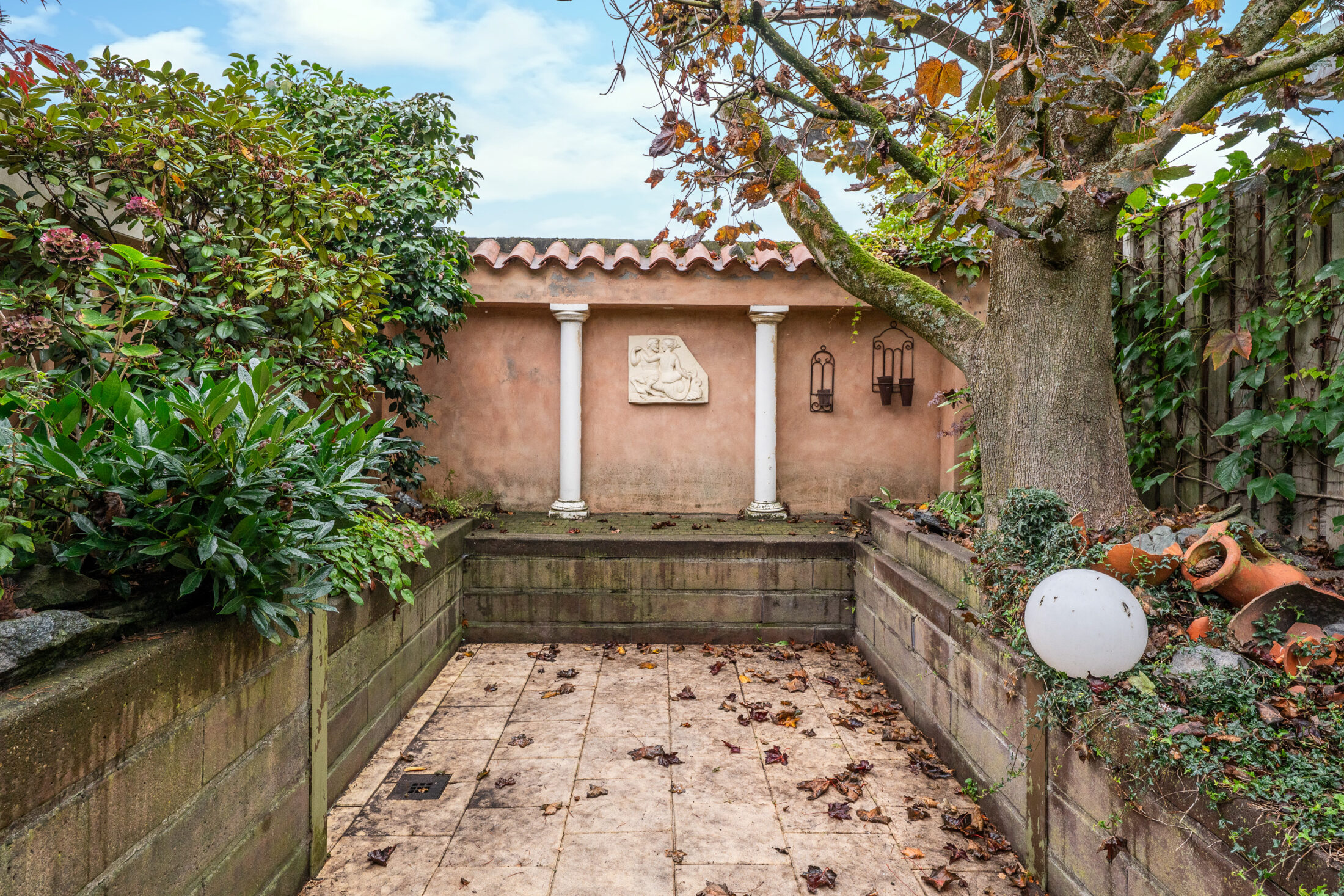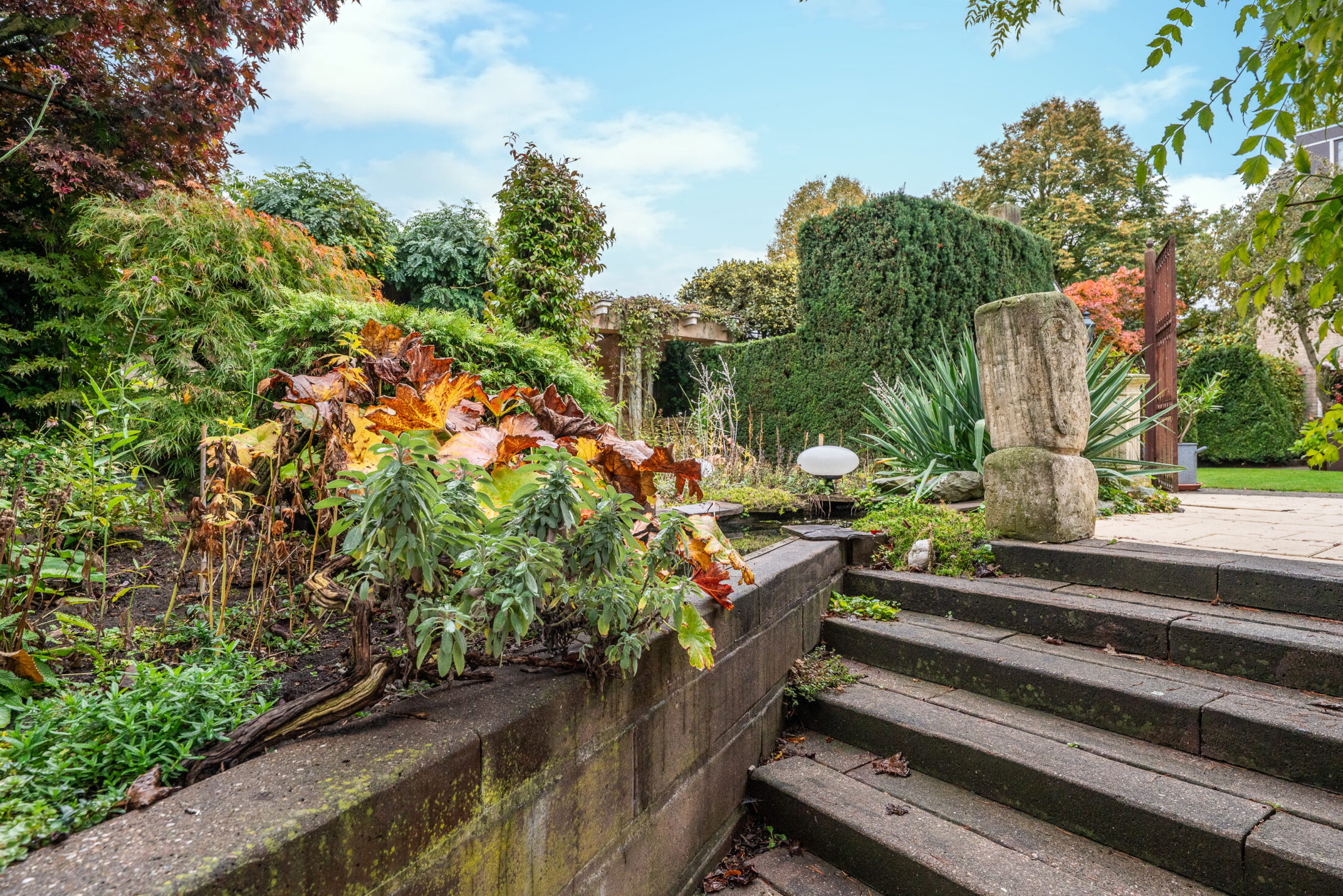 Vanuit het portaal aan de achterzijde van de woning loop je je eigen paradijs binnen. Gemeten vanaf de achtergevel van de woonkamer is deze tuin maar liefst ca. 24 meter diep! Het voorste gedeelte is een mix van bestrating, plantenperken en gras, waardoor er ruimte is voor het plaatsen van uw tuinmeubilair in een ontzettend rustgevende omgeving. Aan de achterzijde – achter de sierlijke poorten – vind je een paradijselijke opstelling van zorgvuldig samengestelde paden, planten, bomen en overige tuinaankledingen. Wat een uitzicht!