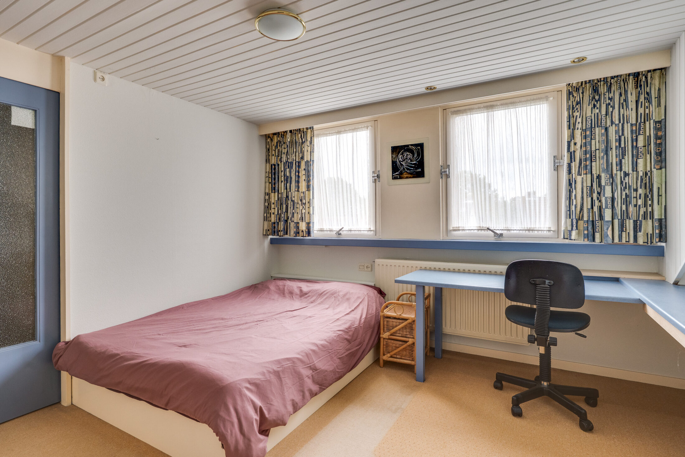 De ruimte in deze slaapkamer wordt optimaal benut door de aanwezigheid van de dakkapel. Hierdoor wordt er flink wat ruimte gewonnen en heb je meer dan genoeg ruimte om het gewenste meubilair voor een tweepersoonsinrichting te plaatsen. De inbouwkasten maken de ruimte af.