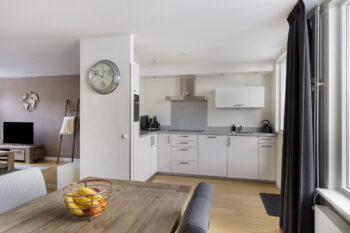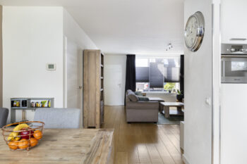 De Z-vormige woonkamer is aan weerszijden voorzien van grote raampartijen. Het zitgedeelte aan de voorzijde van de woning biedt meer dan genoeg ruimte voor een grote zitbank. De achterzijde van de woonkamer huisvest de eettafel en de keuken. Deze staan in open verbinding met elkaar. In het midden van de woonkamer bevindt zich een portaal die naar de toiletruimte en de trapopgang naar de eerste verdieping leidt.