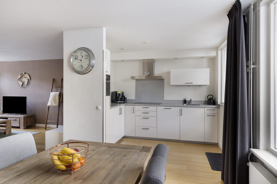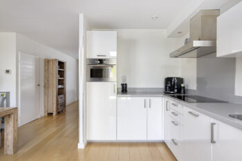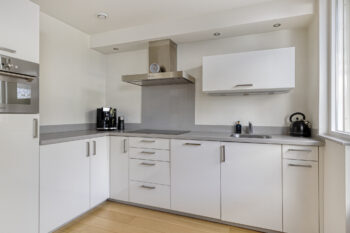 De semi-open keuken is in hoekopstelling uitgevoerd met zowel boven- als onderkasten in witte kleur. Het werkblad en de spatwand zijn van composiet. De keuken voorziet een:
