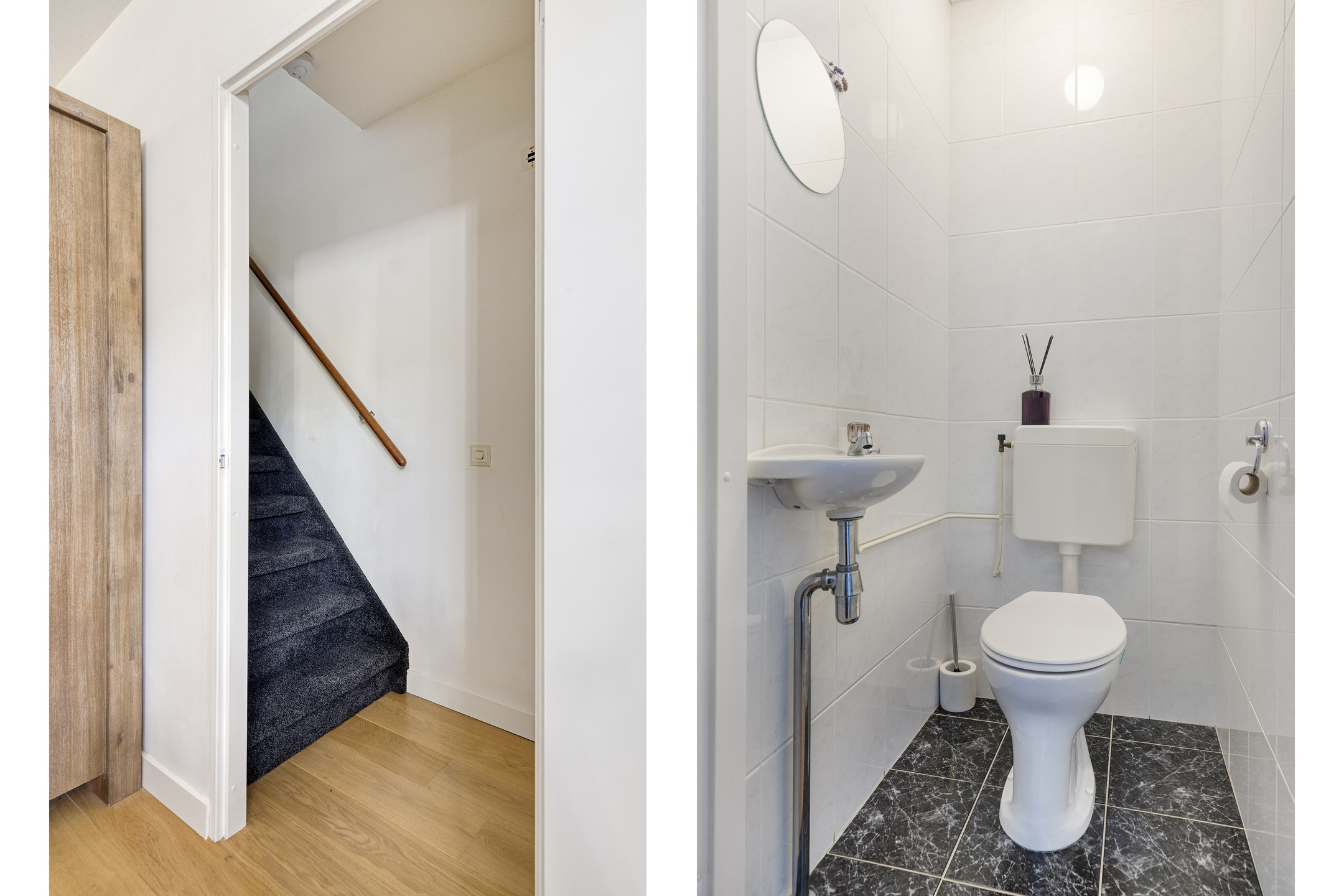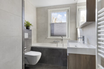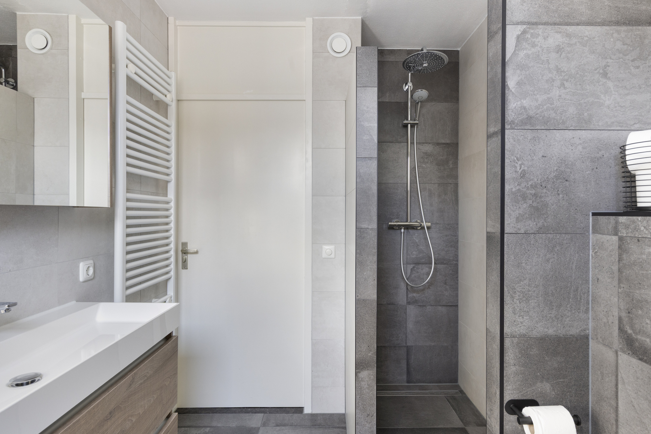 De recent gemoderniseerd en bijzonder stijlvol afgewerkte badkamer bevindt zich aan de voorzijde van de woning. Hier vindt u een inloopdouche, een ligbad, een moderne hangtoilet en een houtlook wastafelmeubel met een grote waskom. De ruimte is volledig betegeld met grote vloer- en wandtegels in verschillende tinten die samen voor een prachtig geheel zorgen. Dit wordt extra benadrukt door de grote hoeveelheid daglicht die het raam binnenlaat. Er is mechanische ventilatie aanwezig.
