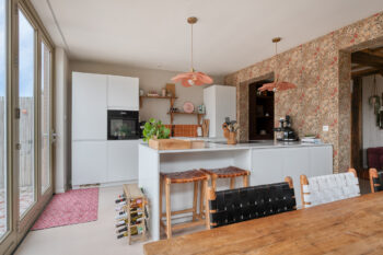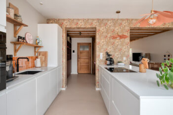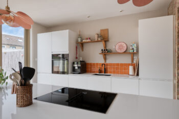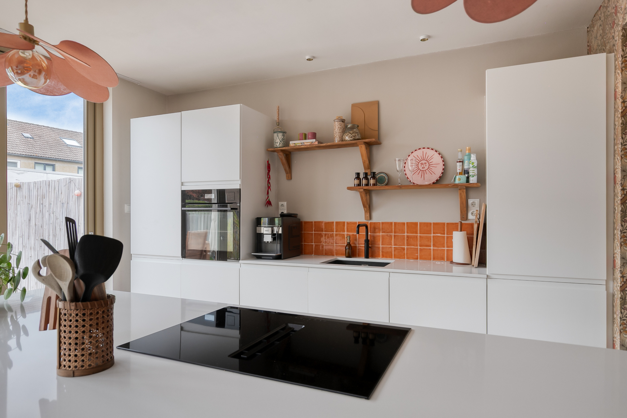 De keuken is een echte blikvanger van de woning: modern, stijlvol en tot in de puntjes afgewerkt. De strakke witte fronten vormen een prachtig contrast met de warme terracottakleurige tegels en