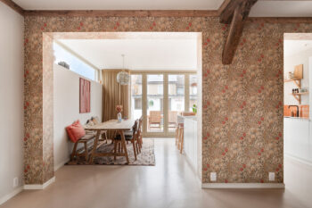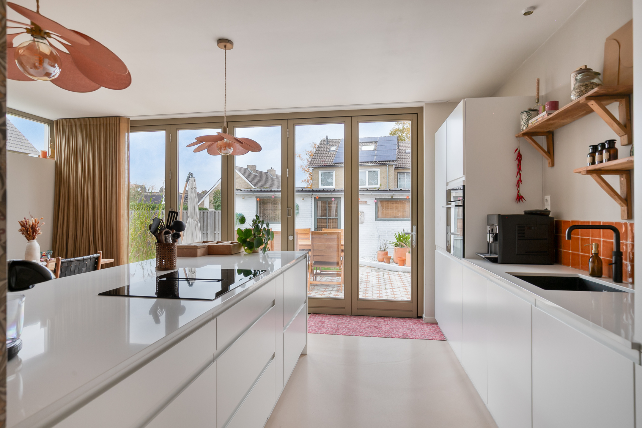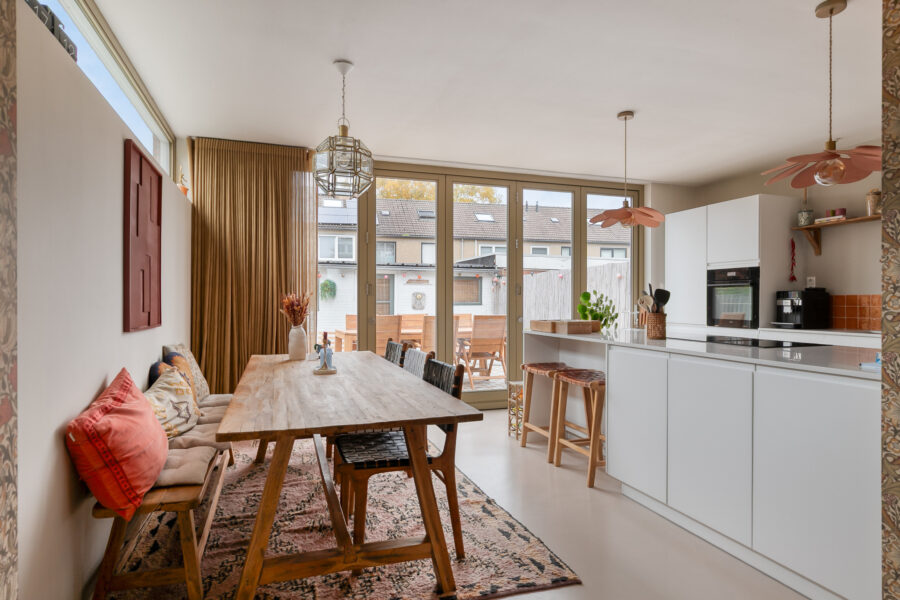 De ruimte is smaakvol ingericht en geniet van een prettige lichtinval. In de ruime uitbouw zorgen de grote harmonicadeuren voor een naadloze verbinding met de tuin.