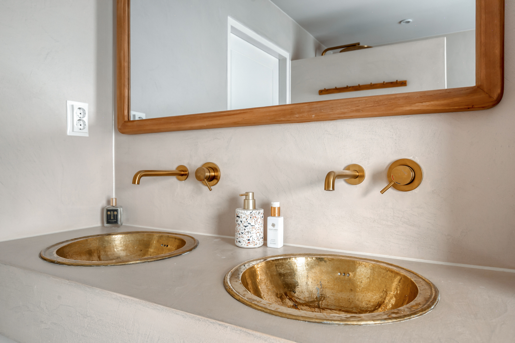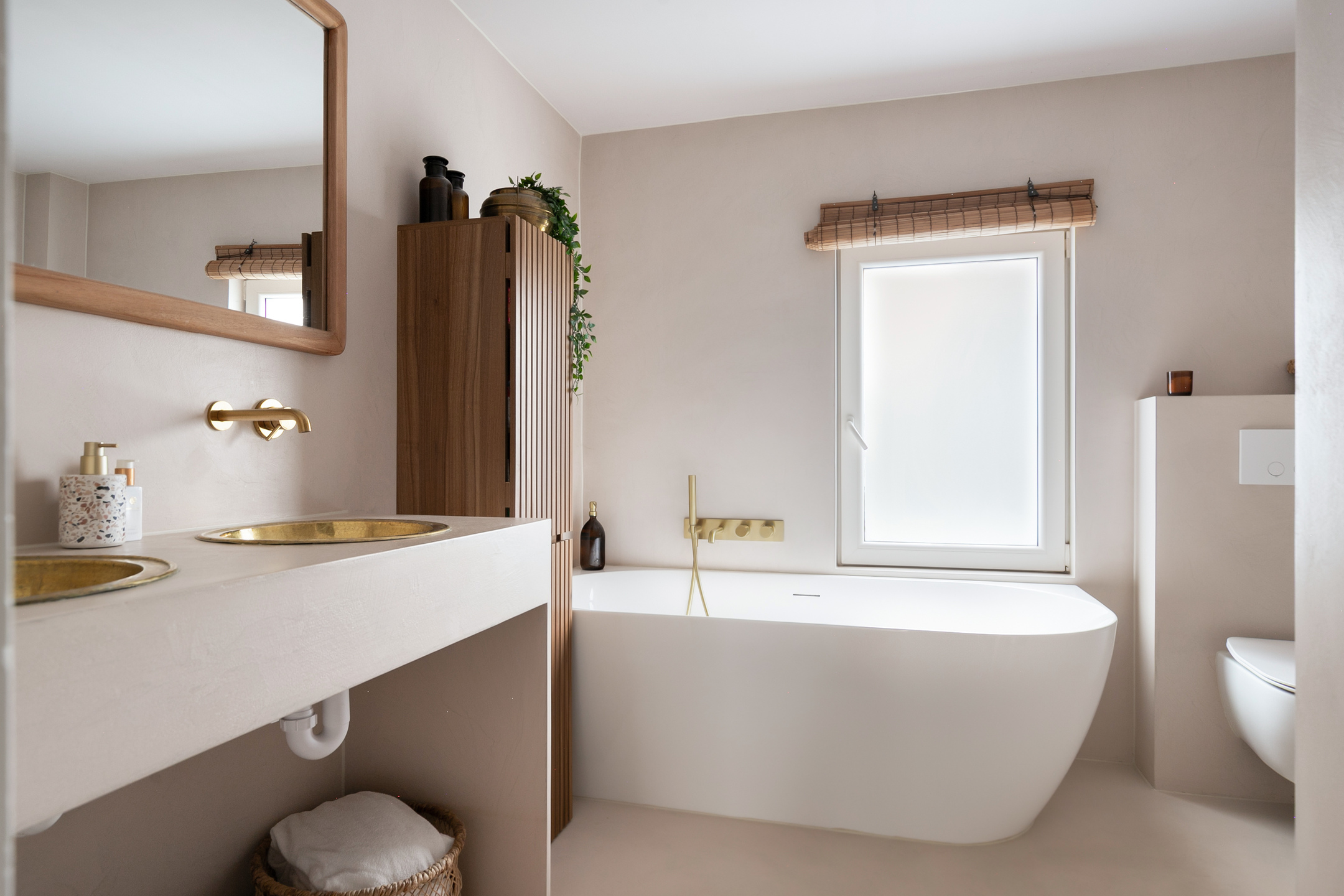 en spa-achtige sfeer. Het vrijstaande ligbad vormt het absolute middelpunt van de ruimte en nodigt uit tot heerlijk ontspannen na een lange dag. De dubbele wastafel met goudkleurige kranen en