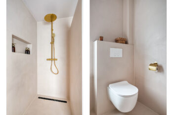 De vloer en wanden zijn afgewerkt met onderhoudsvriendelijk microcement.