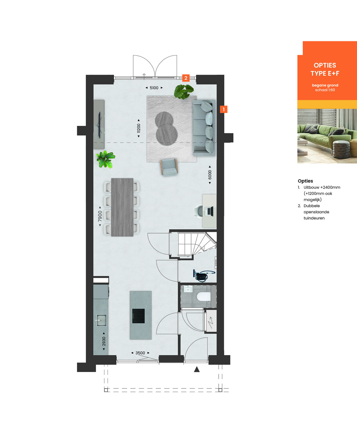 Met de beschikbare opties geef je jouw nieuwe woning eenvoudig een persoonlijke touch. Denk bijvoorbeeld aan een extra ruime woonkamer dankzij een uitbouw van 1,20 of zelfs 2,40 meter aan de achterzijde. Wil je meer verbinding tussen binnen en buiten? Kies dan voor openslaande tuindeuren of een schuifpui.