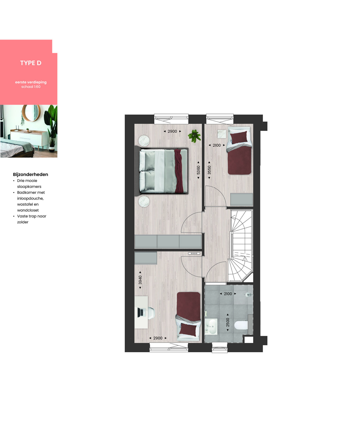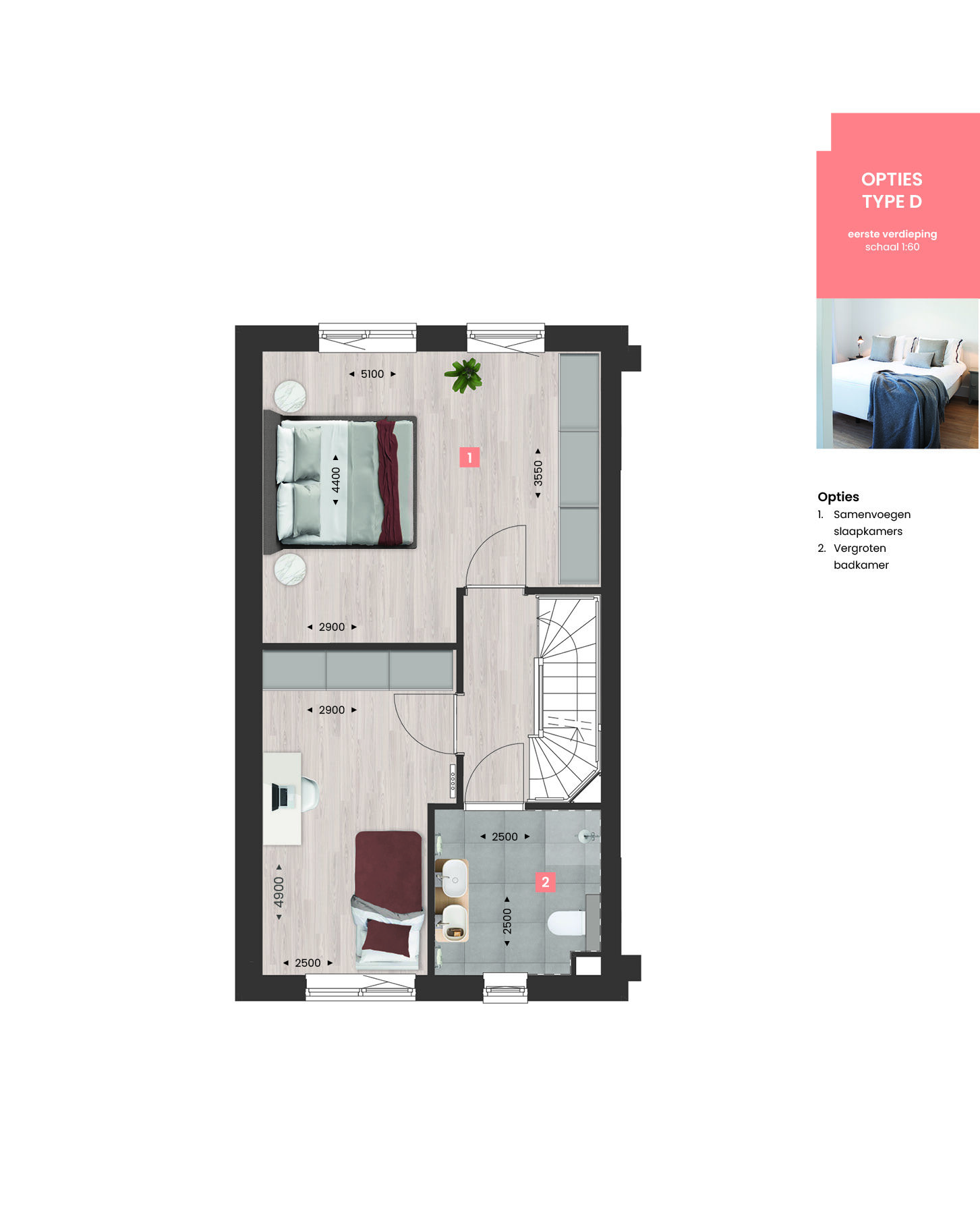 Op de eerste verdieping is het mogelijk om de badkamer te vergroten voor meer comfort, of twee slaapkamers aan de achterzijde samen te voegen tot één ruime slaapkamer met bijvoorbeeld een inloopkast.