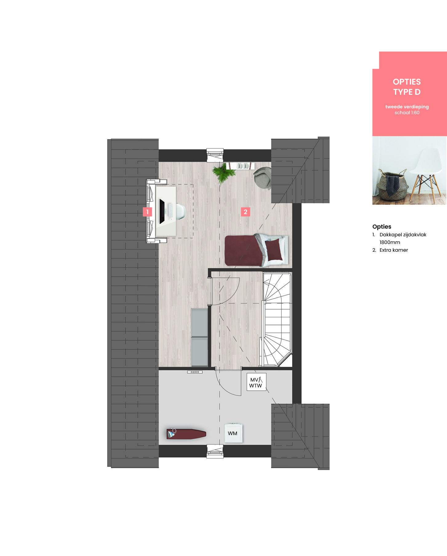 De tweede verdieping biedt diverse indelingsopties. Door het toevoegen van dakkapellen aan de voor- en/of achterzijde kun je hier twee ruime kamers creëren, ideaal voor een extra slaapkamer of een thuiskantoor.