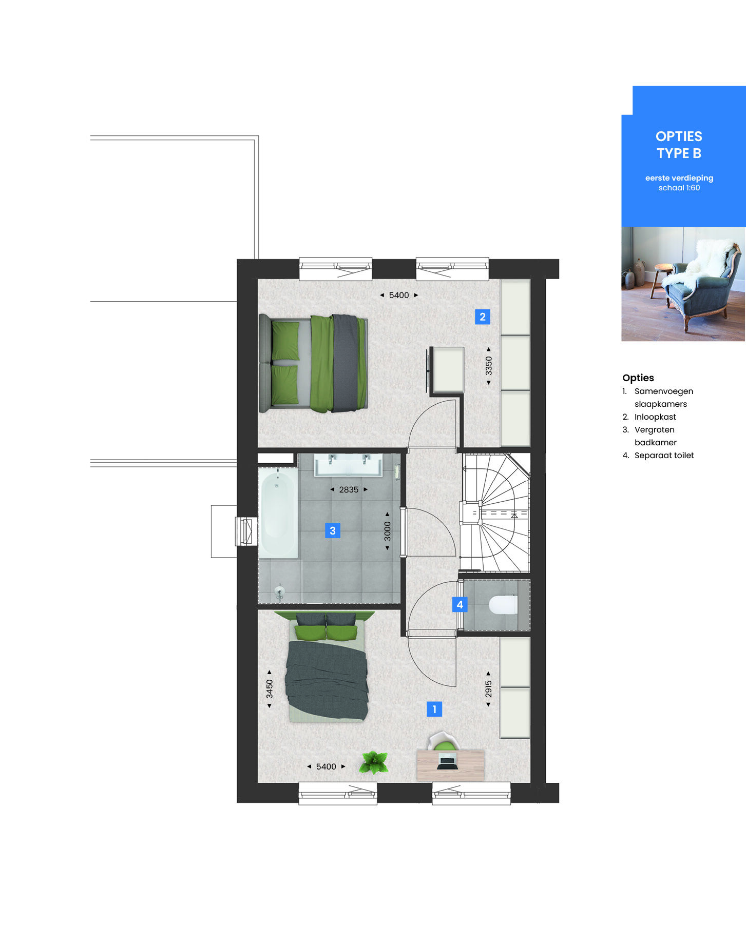 Op de eerste verdieping is het mogelijk om de badkamer te vergroten voor meer comfort, of twee slaapkamers aan de achterzijde samen te voegen tot één ruime slaapkamer met bijvoorbeeld een inloopkast.