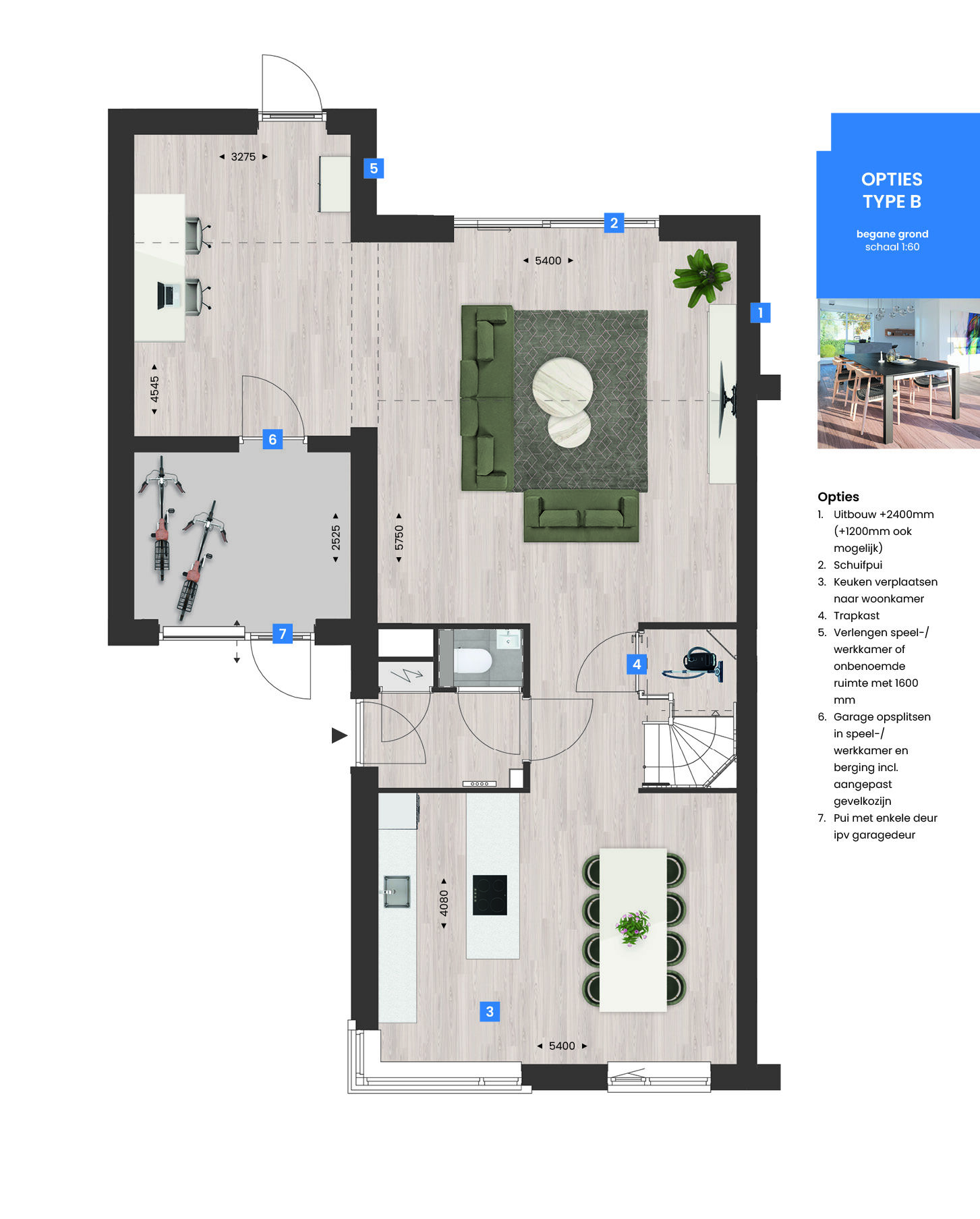 Je hebt volop mogelijkheden om de woning naar eigen wens aan te passen. Vergroot de begane grond met een uitbouw van 1,20 of 2,40 meter, waarbij de keuken eventueel naar de voorzijde kan worden verplaatst. Daarnaast kun je de garage verlengen en/of splitsen in een berging en een extra ruimte, waardoor je meer leefruimte op de begane grond creëert.