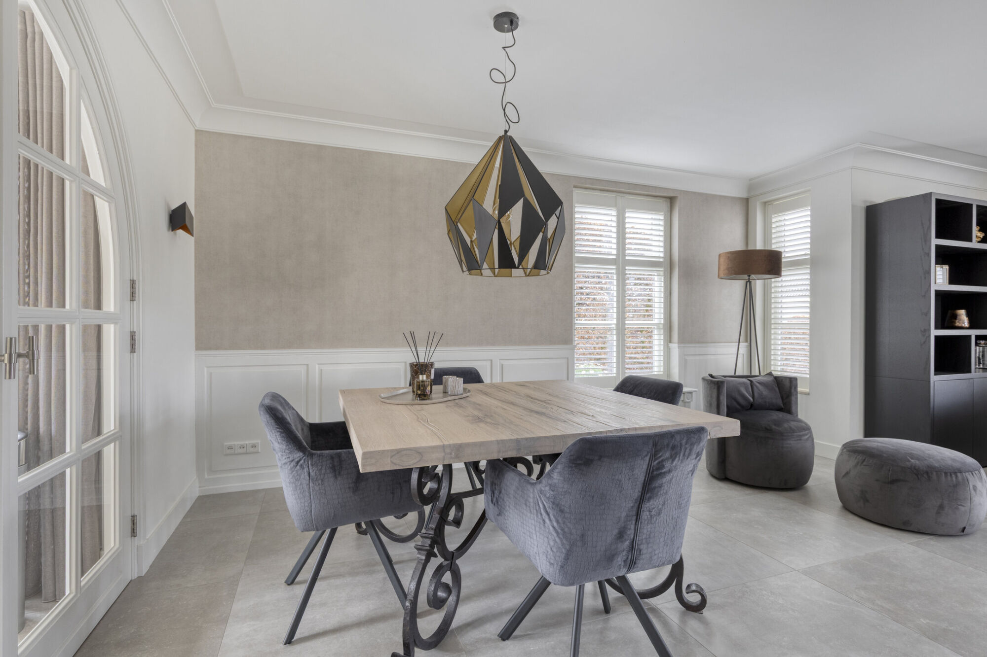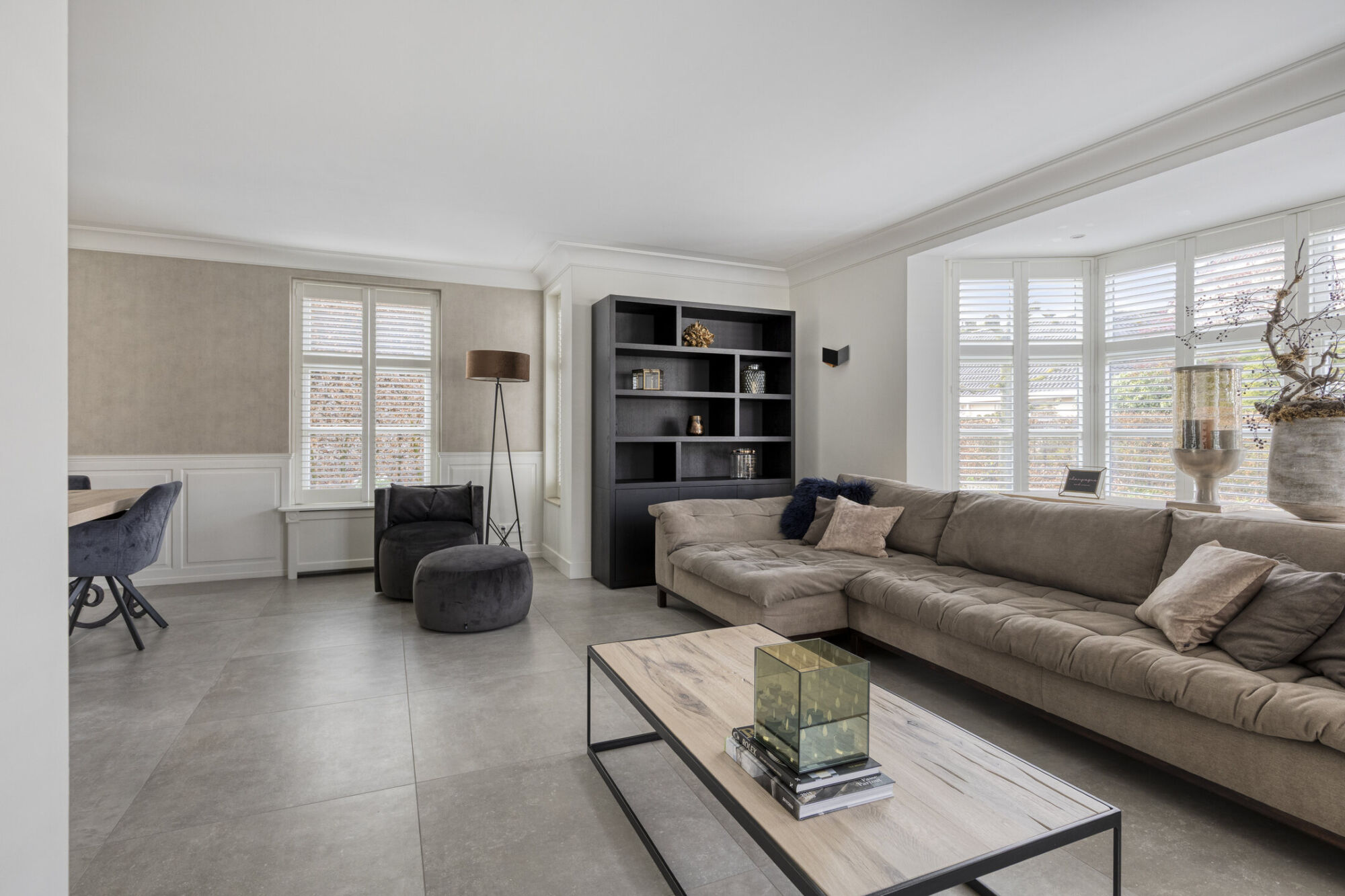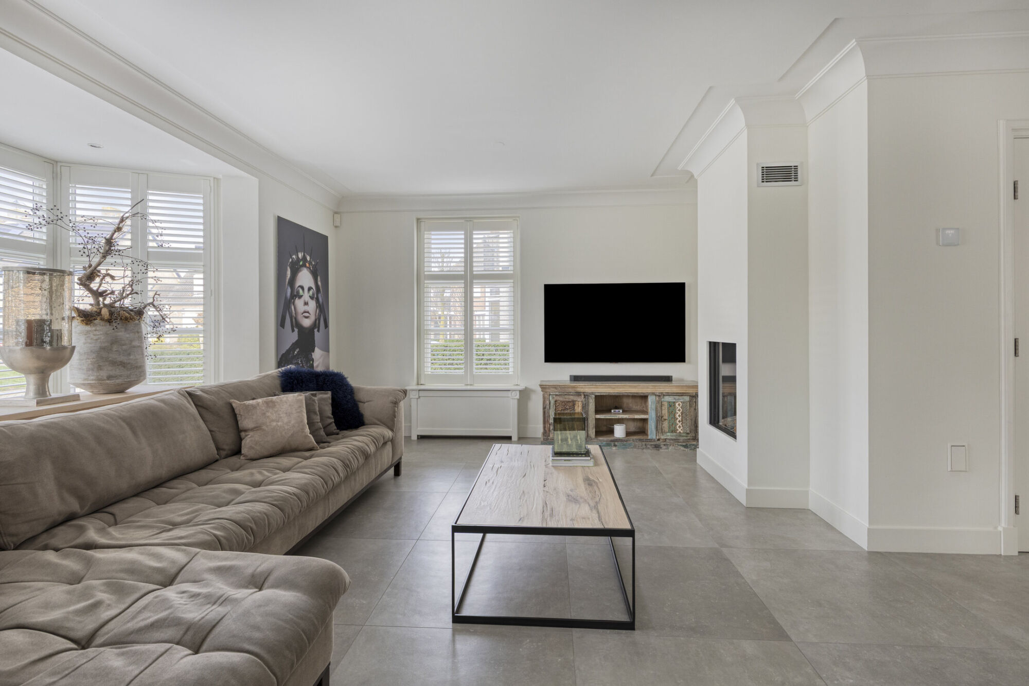 Bij binnenkomst in de woonkamer ervaart u direct een gevoel van ruimte en licht. Dankzij de vele raampartijen aan alle zijden van de ruimte profiteert u hier van een prachtige daglichtinval. Met name de sfeervolle erker aan de voorzijde zorgt niet alleen voor extra licht, maar geeft de ruimte ook een bijzonder karakter. De tegelvloer, in combinatie met comfortabele vloerverwarming en strak gestucte wanden en plafonds met sierlijk lijstwerk, zorgen voor een hoogwaardige en verzorgde uitstraling. Voor extra sfeer en comfort is de woonkamer voorzien van een mooie ingebouwde gashaard.