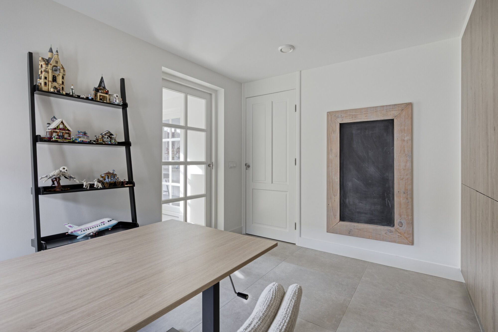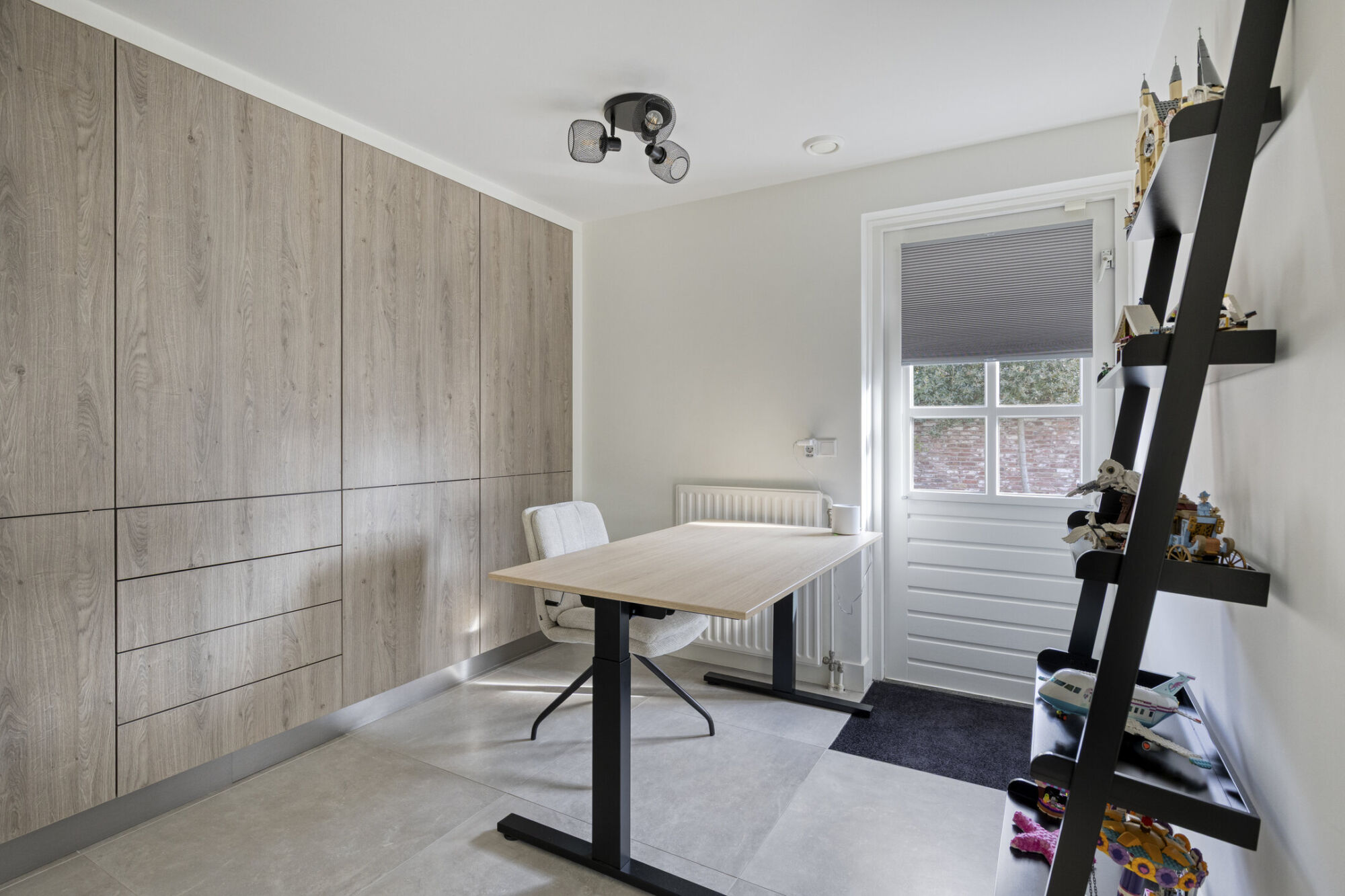 Aan de achterzijde van de woning bevindt zich een multifunctionele ruimte. Deze volledig geïsoleerde en verwarmde ruimte is geschikt voor diverse doeleinden, zoals een speelkamer voor de kinderen, een thuiswerkplek of een bijkeuken. Voor extra gemak zijn er hoogwaardige ingebouwde kasten tegen de wand aanwezig, ideaal voor het opbergen van speelgoed of werkgerelateerde spullen bijvoorbeeld. Bovendien biedt de ruimte via twee loopdeuren direct toegang tot de tuin, wat het zowel praktisch als veelzijdig maakt.