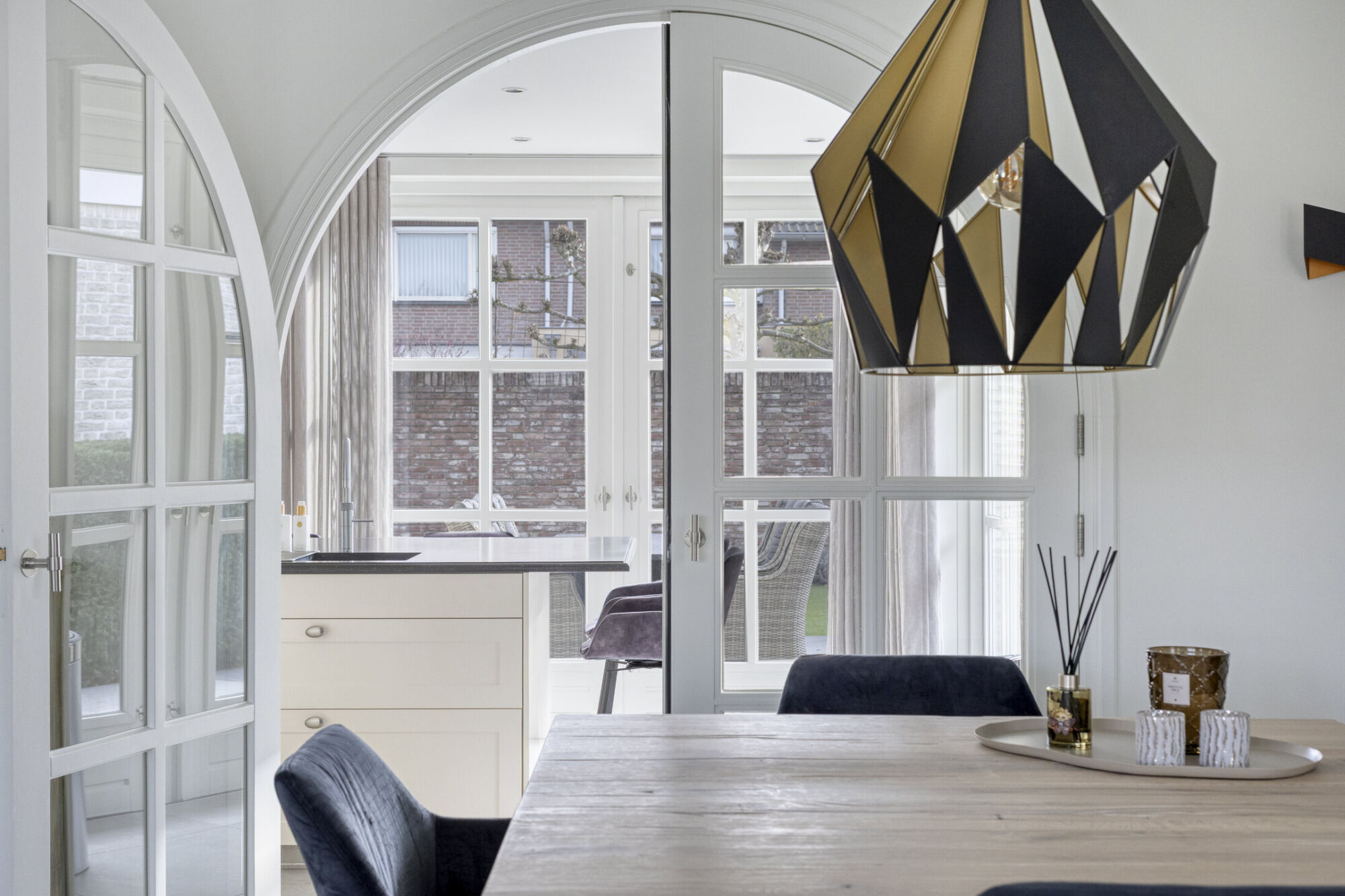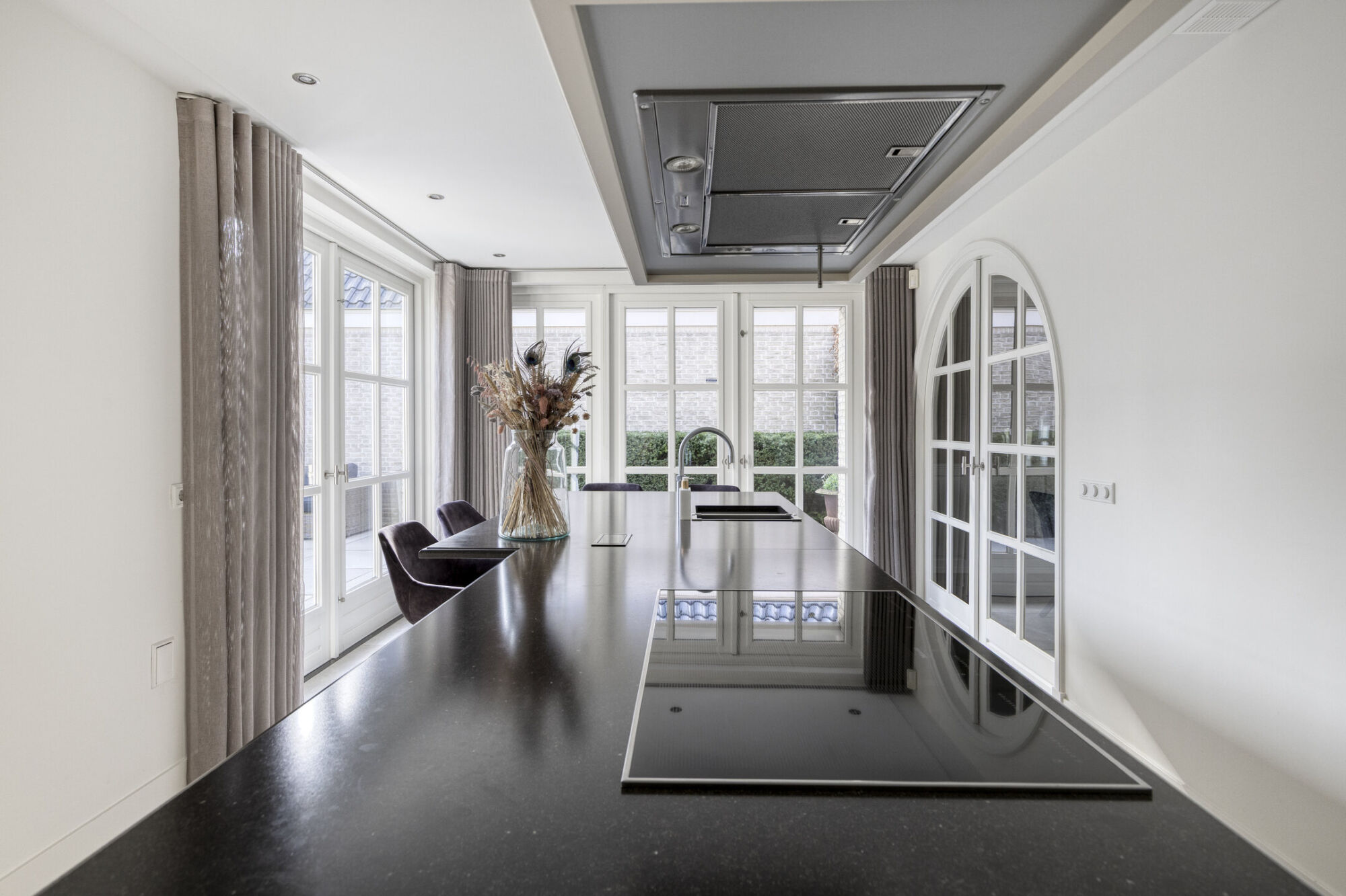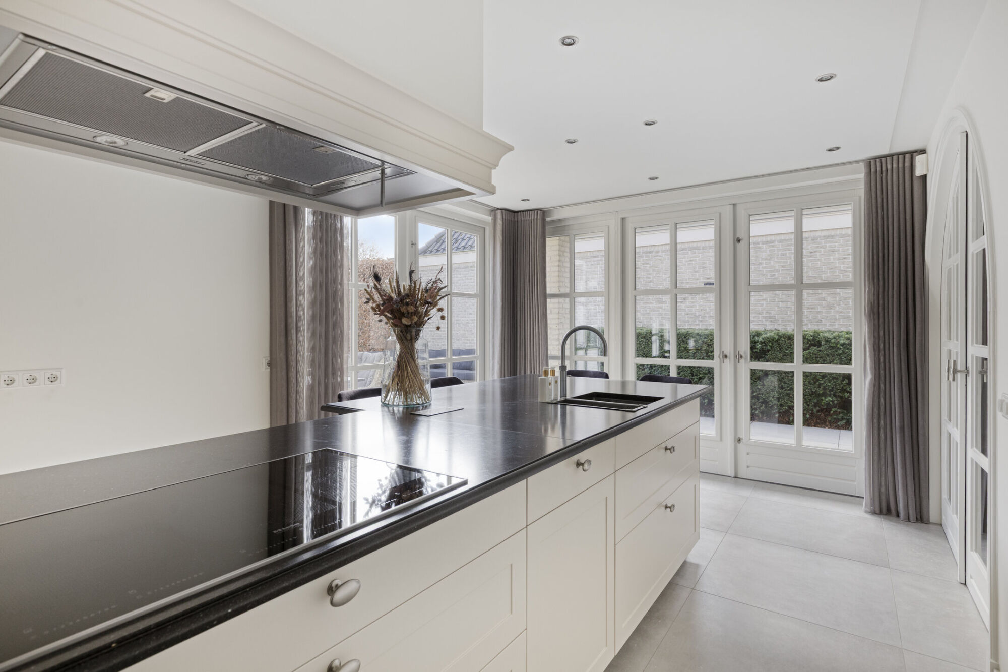 Vanuit de woonkamer bereikt u via de prachtige en-suite openslaande deuren de royale keuken. Ook deze ruimte is ruim van opzet. Mede dankzij de twee grote puien met openslaande deuren naar de tuin en de overkapping, komt er een overvloed aan daglicht binnen. Dit draagt mede bij aan het lichte en aangename karakter van de woning.