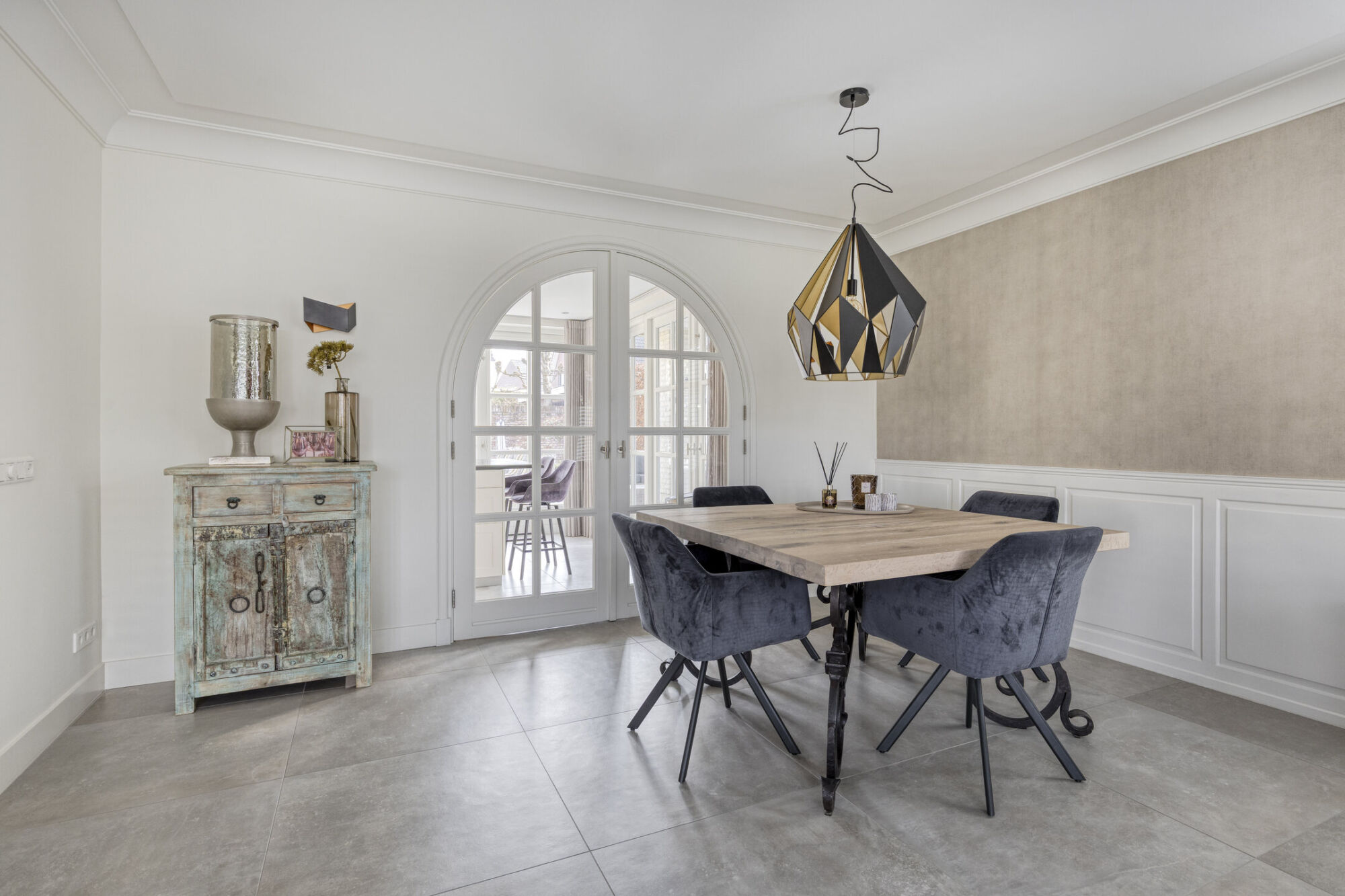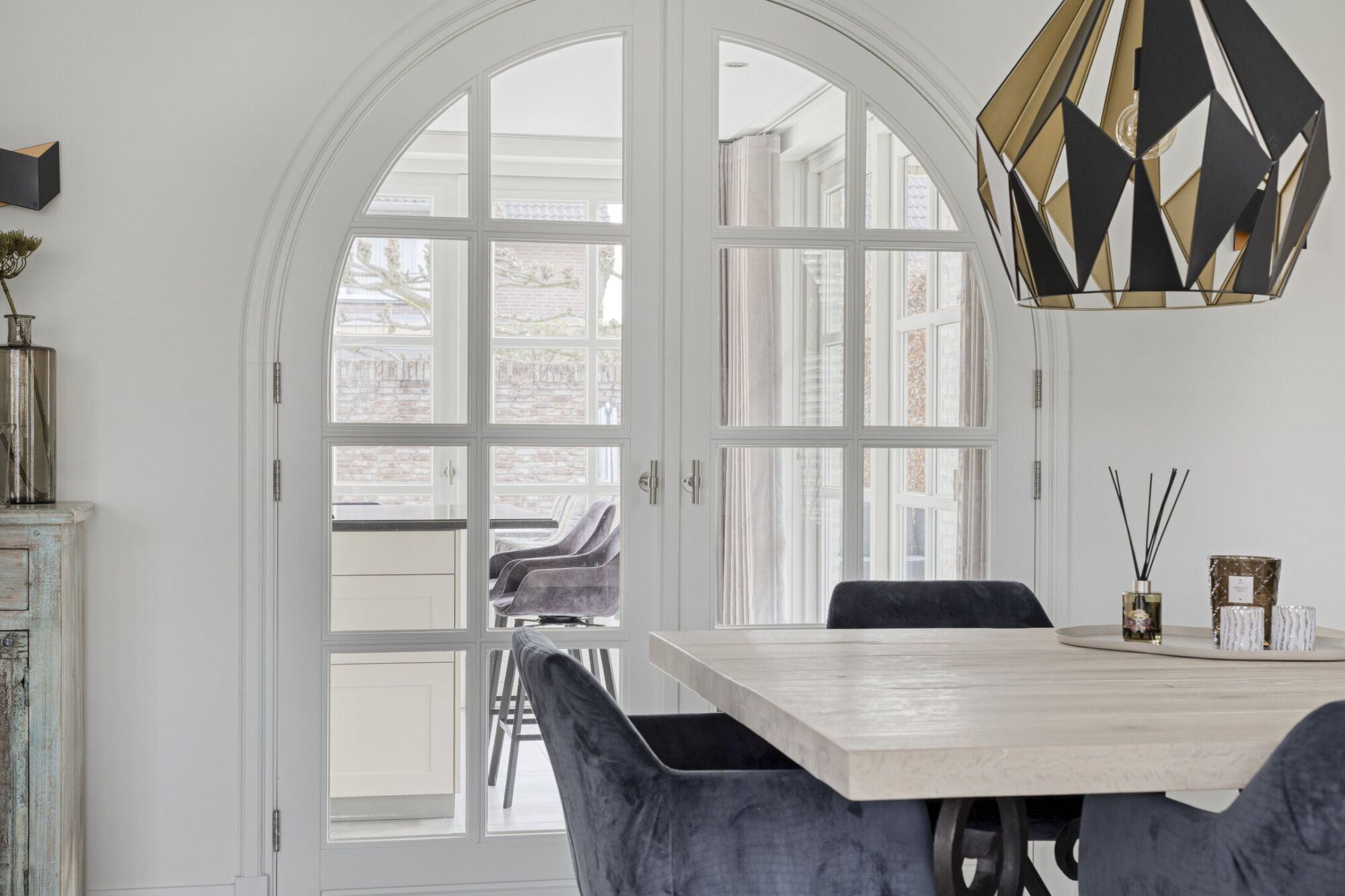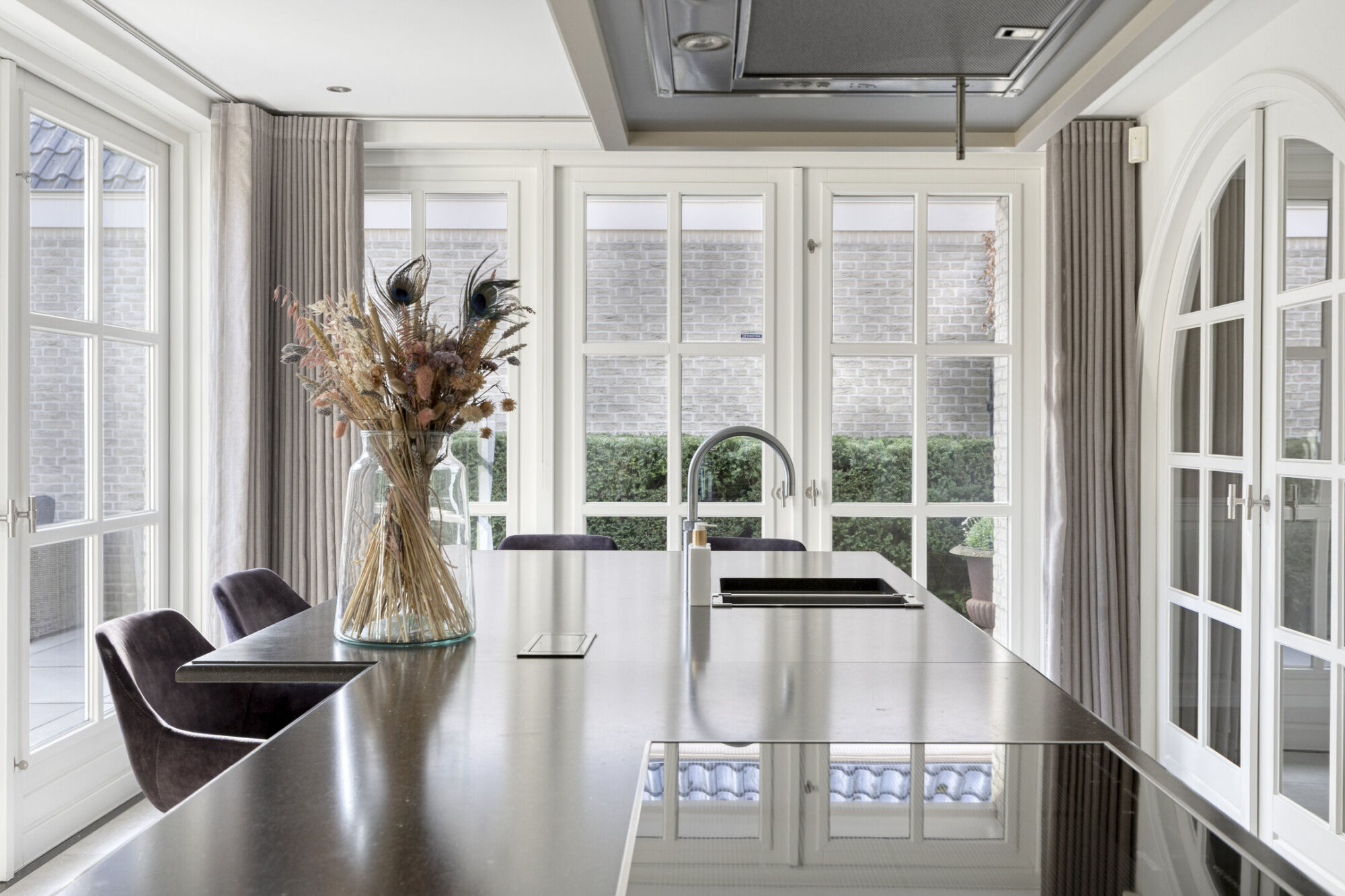 Vanuit de woonkamer bereikt u via de prachtige en-suite openslaande deuren de royale keuken. Ook deze ruimte is ruim van opzet. Mede dankzij de twee grote puien met openslaande deuren naar de tuin en de overkapping, komt er een overvloed aan daglicht binnen. Dit draagt mede bij aan het lichte en aangename karakter van de woning.