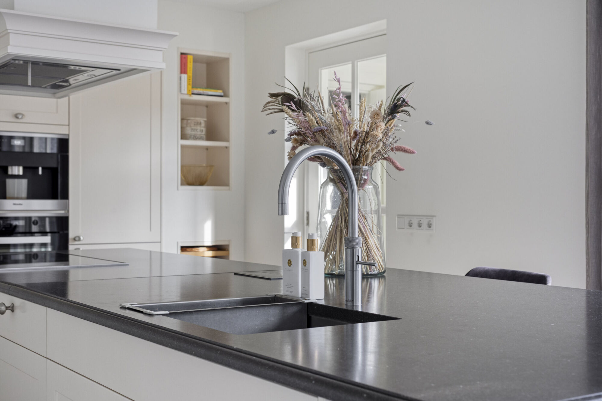 De keuken is luxe uitgevoerd (Miele apparatuur) en beschikt over een ingebouwde wandopstelling in combinatie met een groot kookeiland. In de wand is extra opbergruimte gecreëerd, fraai vormgegeven met leuke nisjes die zorgen voor een speels en stijlvol effect. Aan inbouwapparatuur ontbreekt het hier niet: zo is de keuken voorzien van een inbouwkoffiezetapparaat, combi-oven, inductiekookplaat, afzuigkap, koel-vriescombinatie en een vaatwasser.