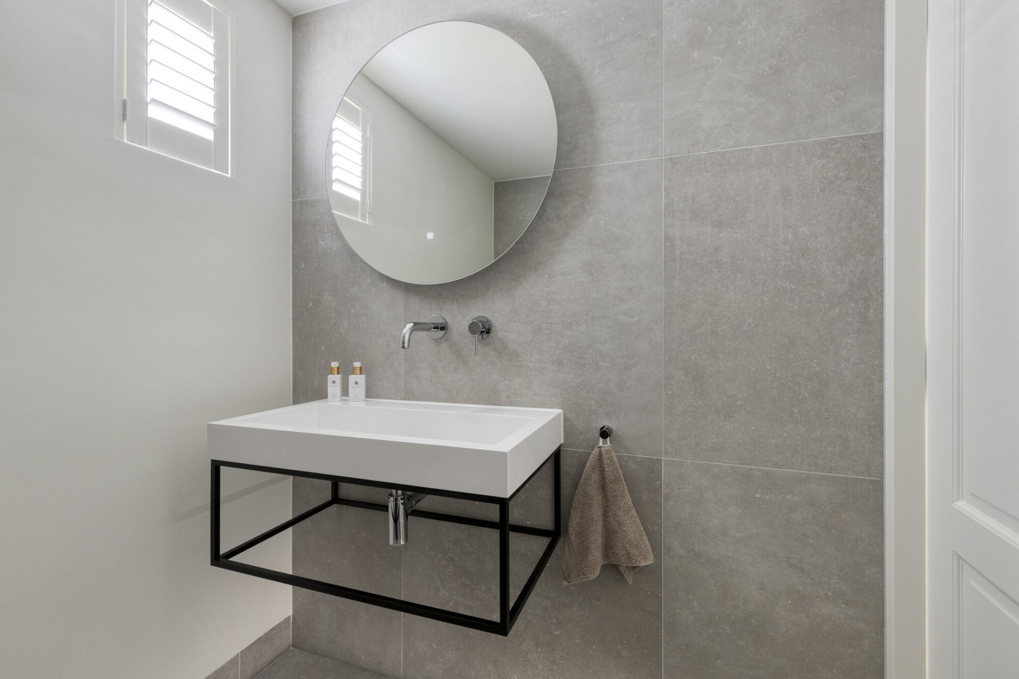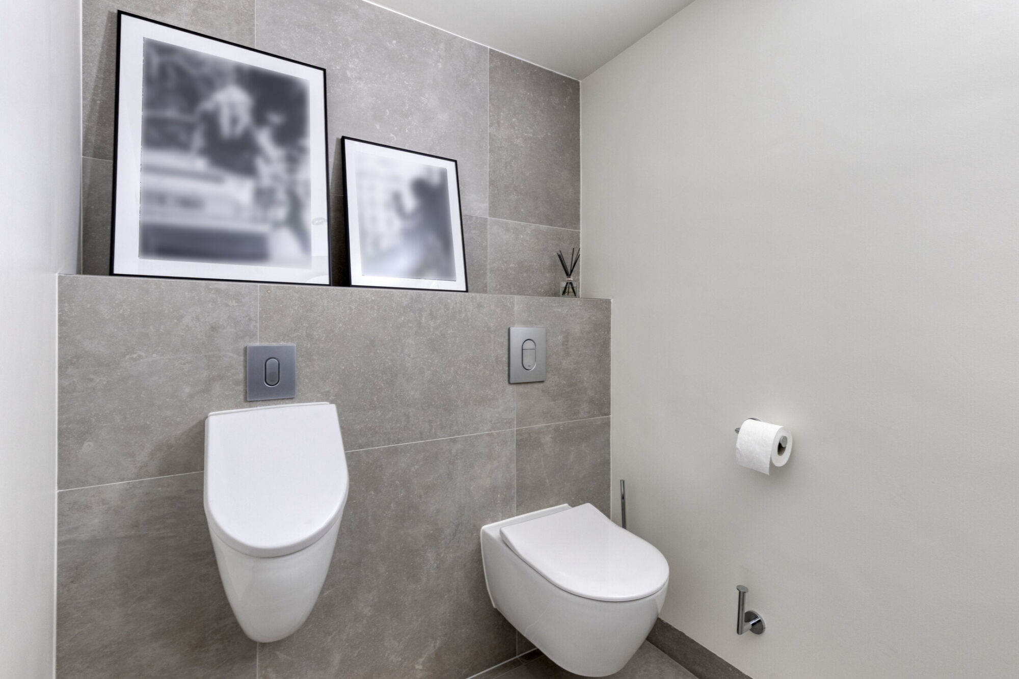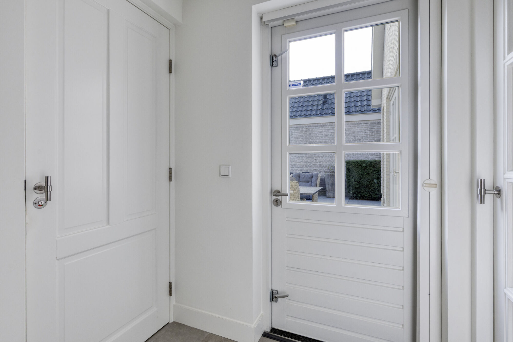 Vanuit de keuken bereikt u een praktische hal. Deze verkeersruimte biedt toegang tot de achterom, het gastentoilet en een multifunctionele kamer op de begane grond. Het gastentoilet is verrassend ruim van opzet en voorzien van een hangend toilet, een urinoir en een royale wastafel. De ruimte is stijlvol betegeld en beschikt over een speels plateautje, ideaal voor decoratie. Daarnaast zorgt een raam voor prettig daglicht en biedt het de mogelijkheid tot natuurlijke ventilatie.