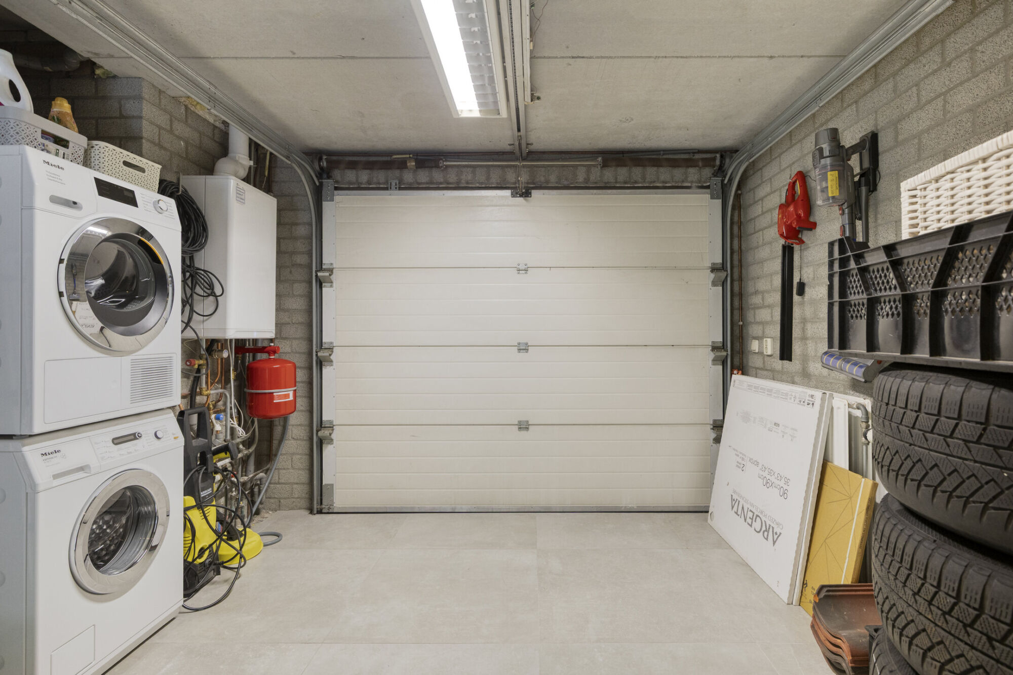 De elektrische roldeur zorgt voor optimaal gebruiksgemak, en er is voldoende ruimte voor het stallen van bijvoorbeeld kleinere voertuigen of fietsen. Daarnaast biedt de garage mogelijkheden voor extra bergruimte, zoals een extra koelkast en vriezer.