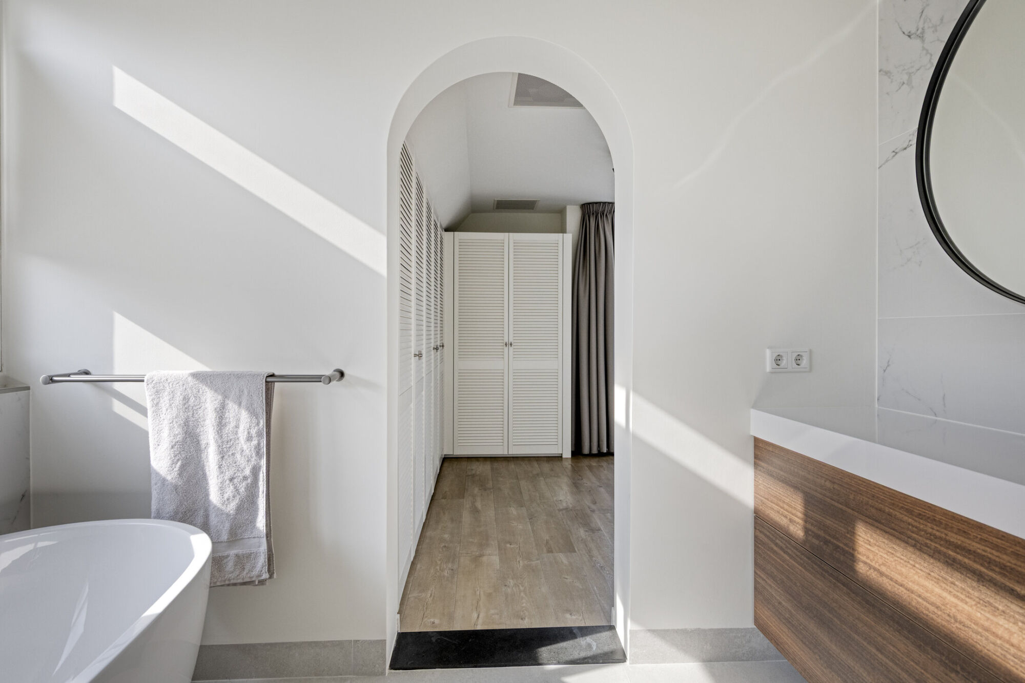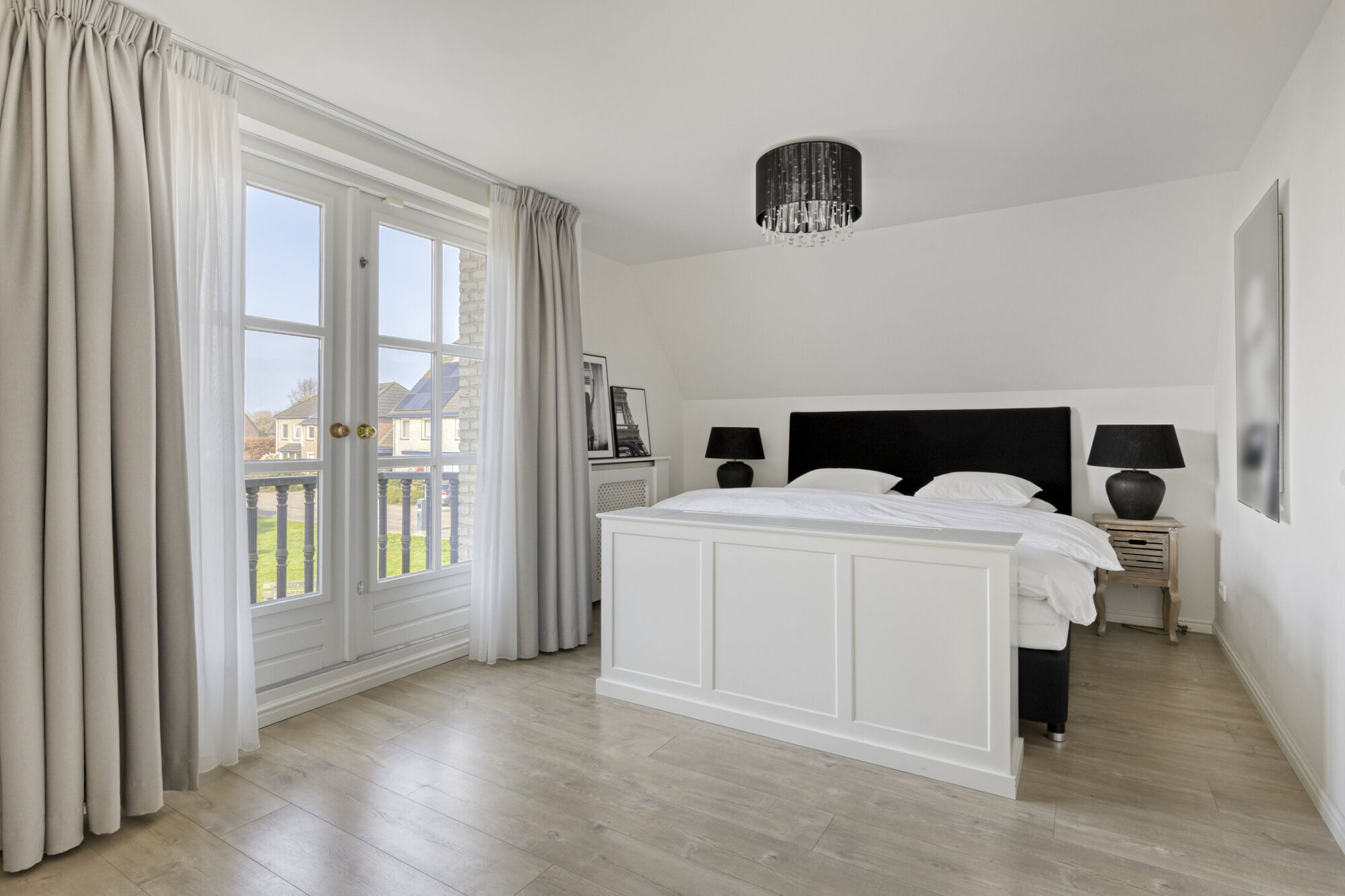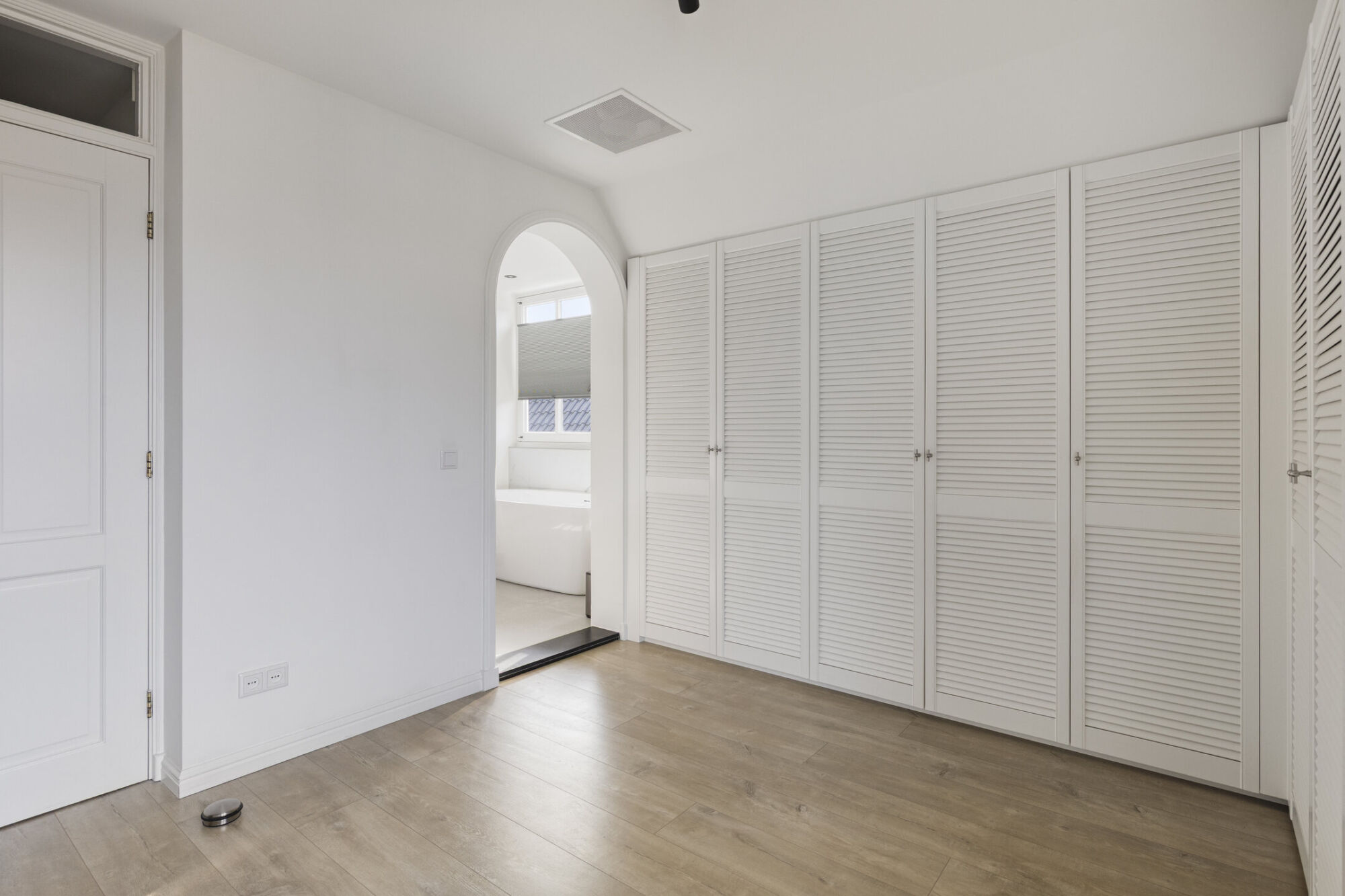 De hoofdslaapkamer ligt aan de voorzijde en is ruim opgezet, met voldoende plek voor een tweepersoonsbed en extra meubels. Ingebouwde kasten bieden praktische opbergruimte. Via openslaande deuren bereikt u het balkon, dat zorgt voor veel licht en een prettig uitzicht. Airconditioning biedt extra comfort. De en-suite badkamer is luxe uitgevoerd met een vrijstaand ligbad, wastafelmeubel en toilet. Grote ramen zorgen voor veel licht en een fijne sfeer, versterkt door inbouwspots in de avond.