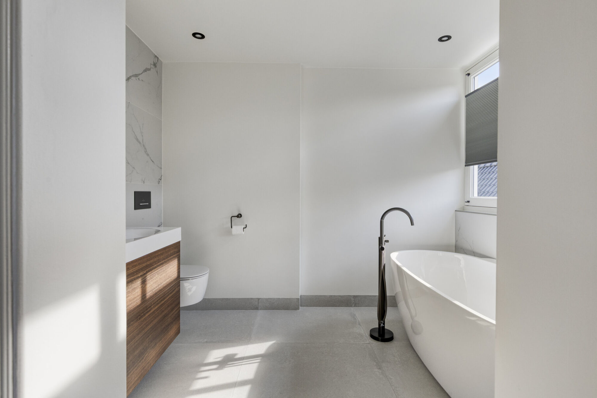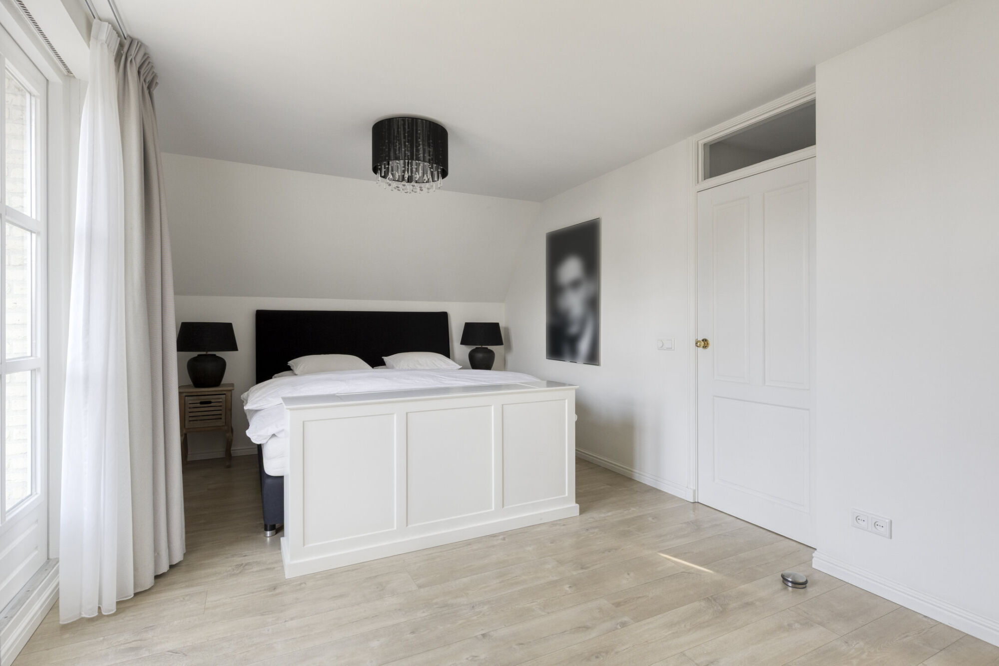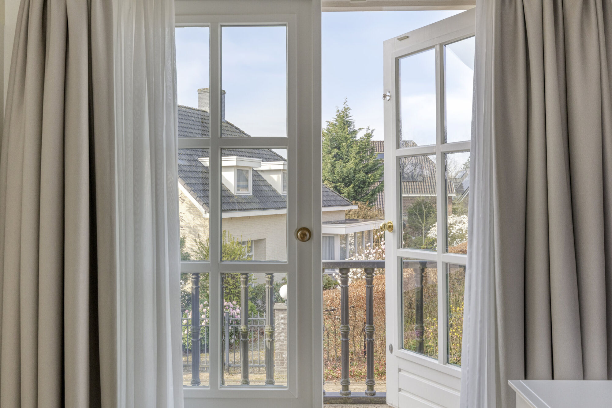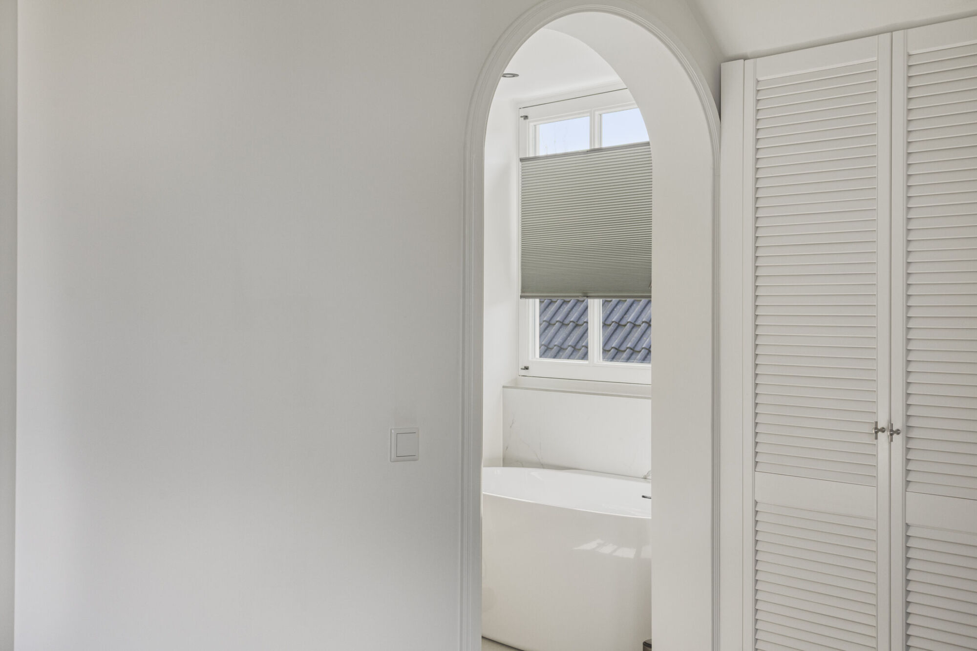 De hoofdslaapkamer ligt aan de voorzijde en is ruim opgezet, met voldoende plek voor een tweepersoonsbed en extra meubels. Ingebouwde kasten bieden praktische opbergruimte. Via openslaande deuren bereikt u het balkon, dat zorgt voor veel licht en een prettig uitzicht. Airconditioning biedt extra comfort. De en-suite badkamer is luxe uitgevoerd met een vrijstaand ligbad, wastafelmeubel en toilet. Grote ramen zorgen voor veel licht en een fijne sfeer, versterkt door inbouwspots in de avond.