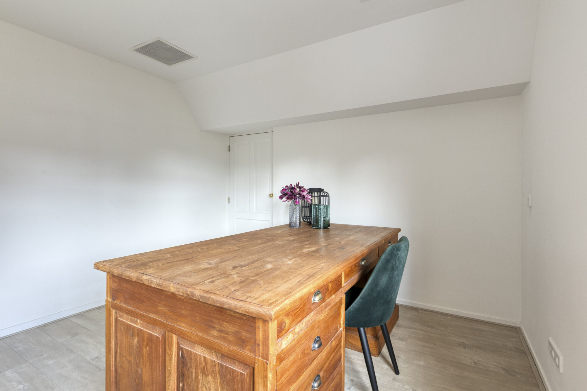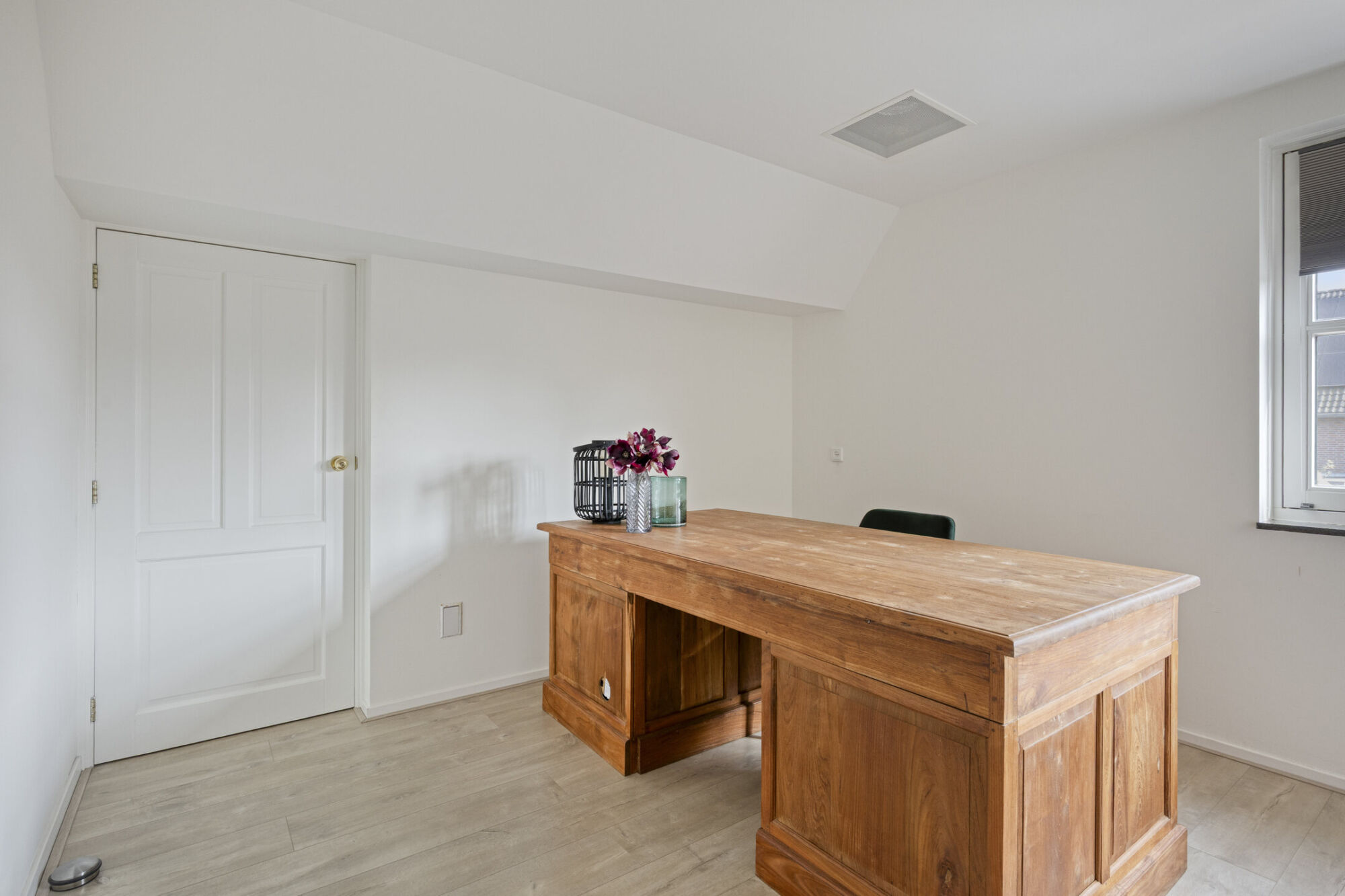 De tweede slaapkamer op deze verdieping ligt aan de achterzijde en is iets kleiner dan de hoofdslaapkamer. Momenteel wordt deze ruimte gebruikt als thuiswerk- of studeerkamer, maar de afmetingen maken het ook geschikt voor andere doeleinden.