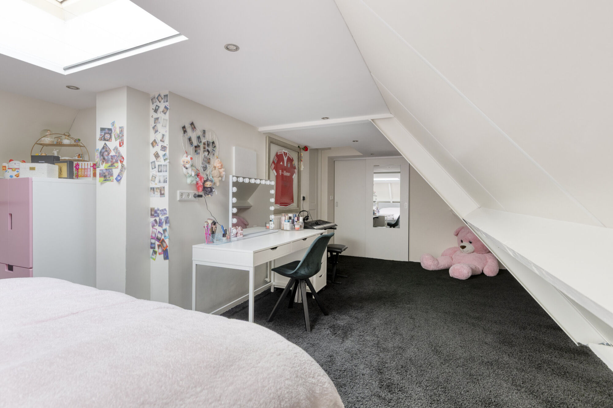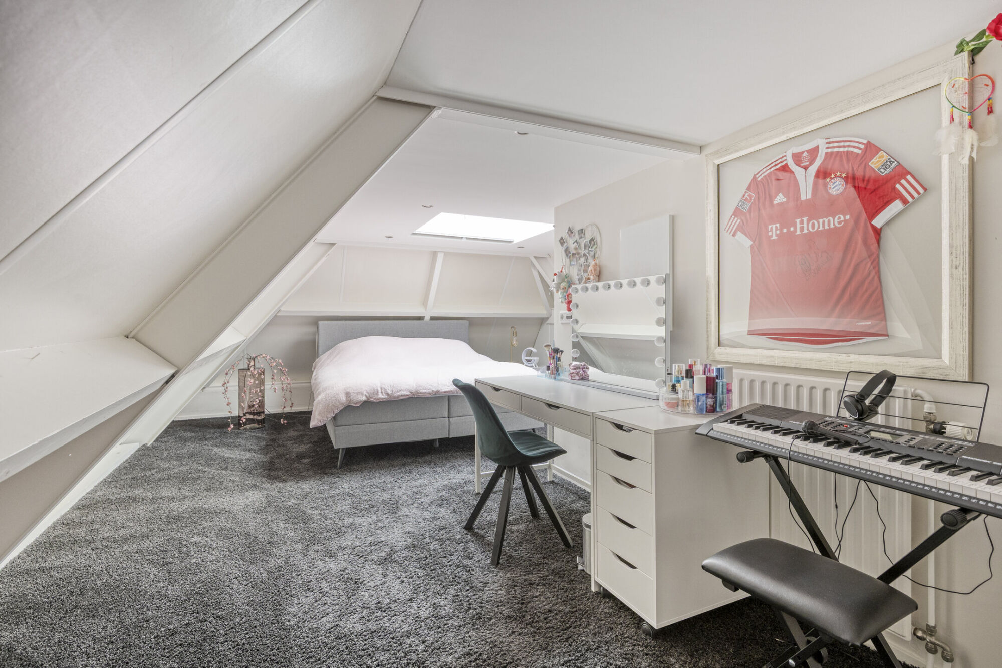 Via de tweede slaapkamer bereikt u de zeer ruime derde slaapkamer, gelegen boven de garage en multifunctionele ruimte. Deze kamer is perfect van formaat, bijvoorbeeld voor een tiener, met voldoende plek voor een groot tweepersoonsbed en een bureau. Ideaal voor rustig studeren of even terugtrekken van de rest. Daarnaast is er een grote ingebouwde bergruimte aanwezig, ideaal voor kleding en overige spullen. De prachtige lichtkoepel zorgt voor veel daglicht en maakt deze slaapkamer helemaal compleet.