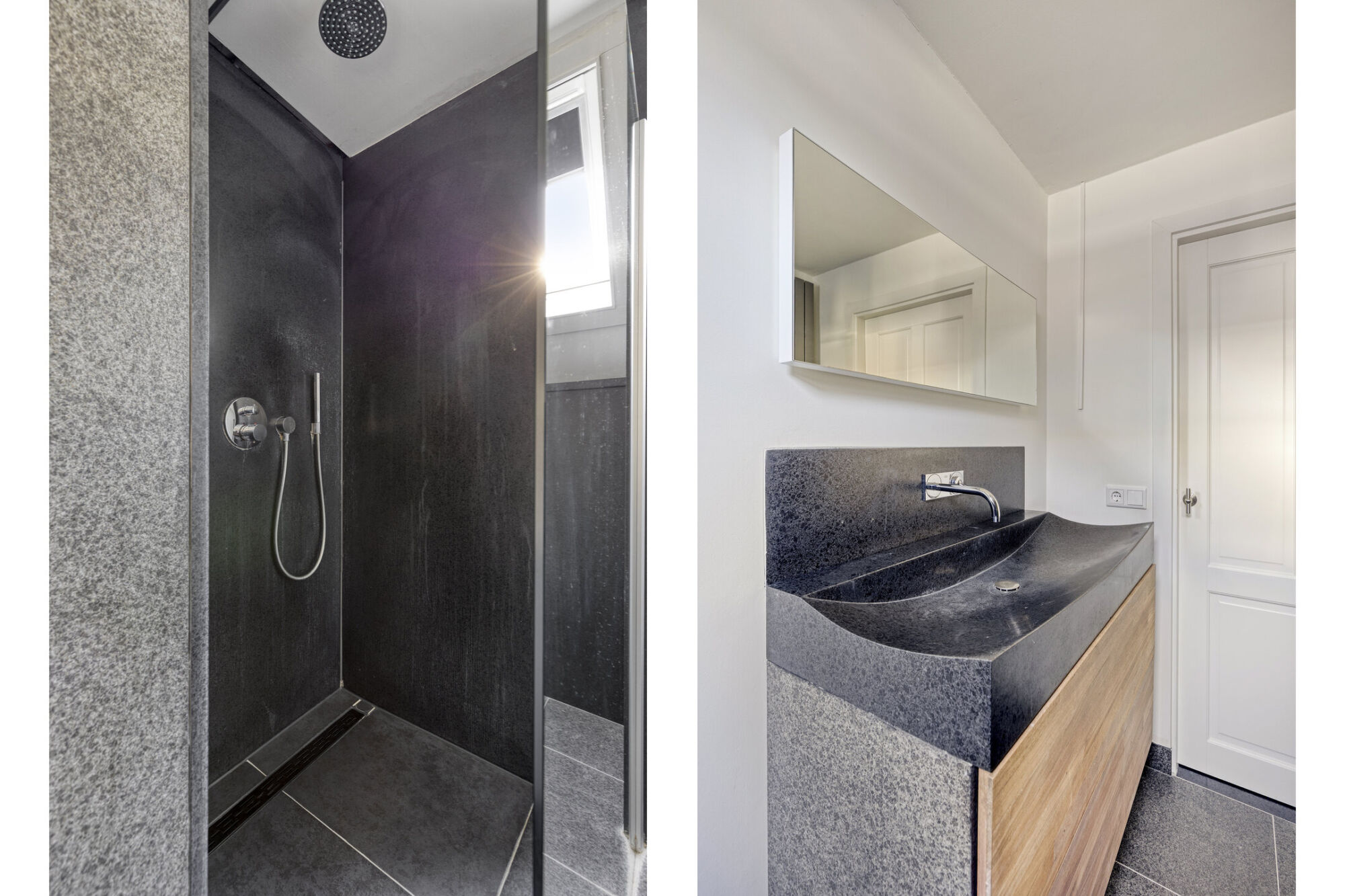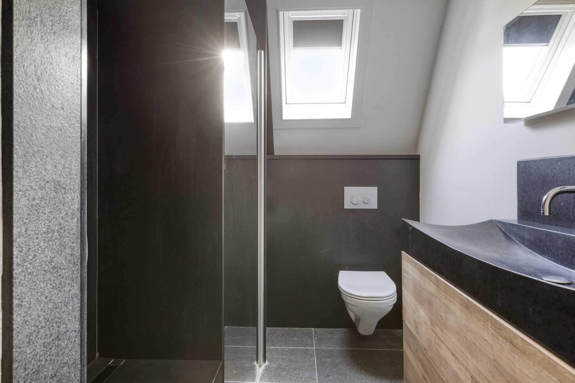 De tweede badkamer is toegankelijk via de overloop en is voorzien van diverse sanitaire voorzieningen. Zo beschikt deze ruimte over een ruime inloopdouche met scheidingswand, een wastafel met meubel en een toilet. De badkamer is netjes betegeld en voorzien van een raampje, wat zorgt voor daglicht en ventilatie.