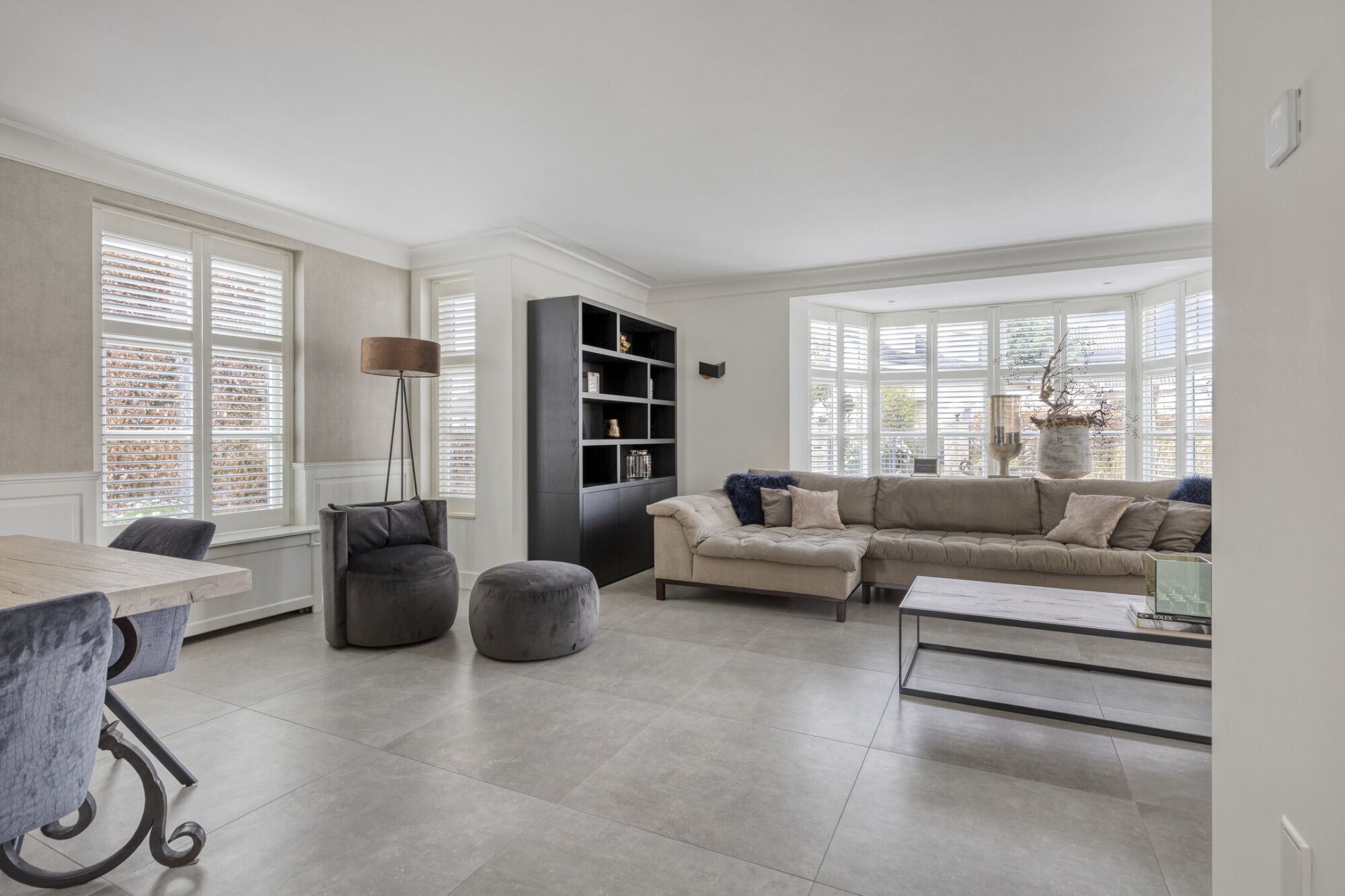 De woonkamer is zeer royaal van opzet. Bij de erker is er volop ruimte voor een grote zithoek, waar u heerlijk kunt ontspannen bij de haard. Aan de achterzijde, nabij de keuken, is er plek voor een ruime eethoek.