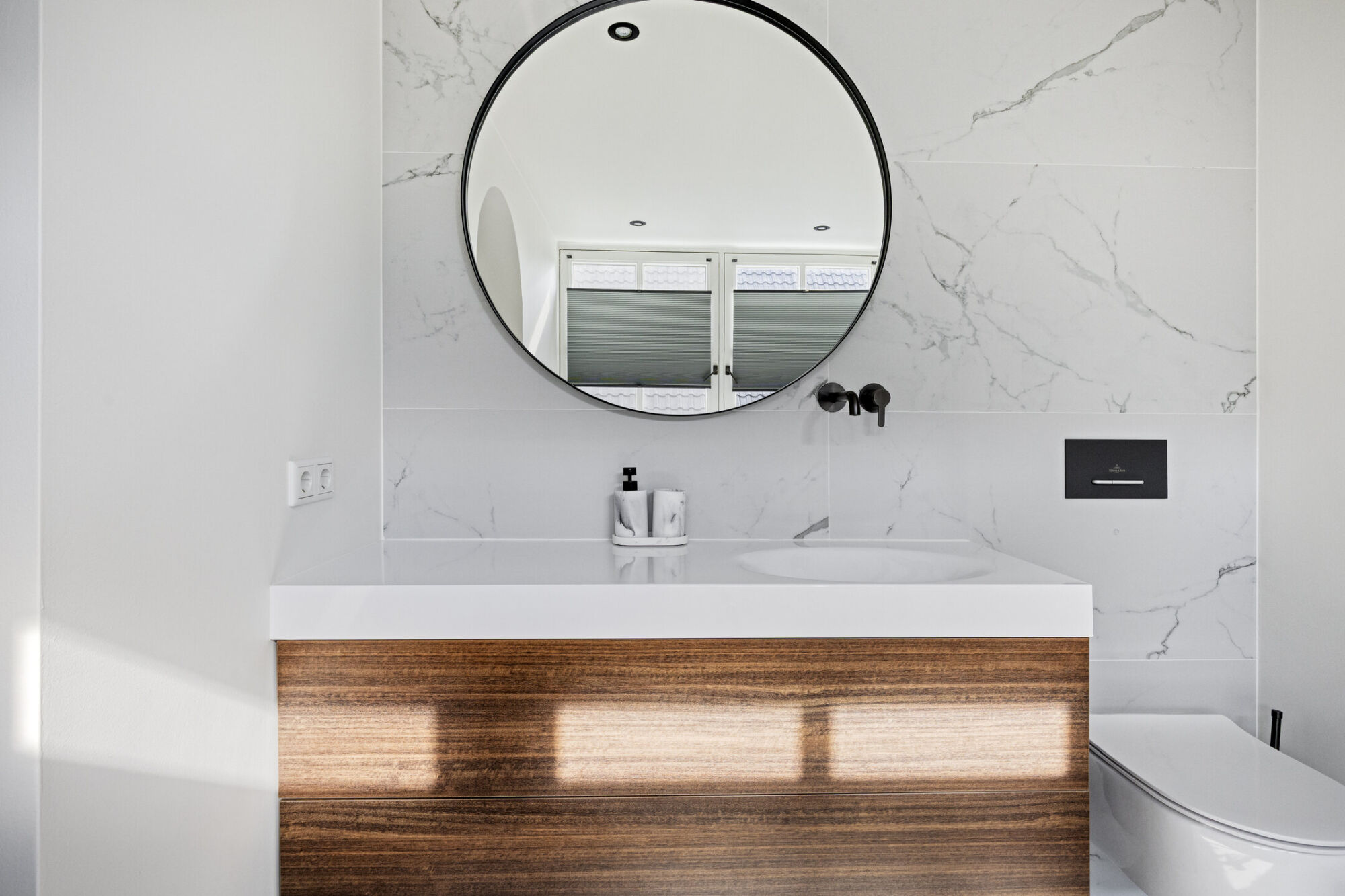Daarnaast is er een spoel- en wasbak met Quooker-kraan aanwezig. Het geheel wordt stijlvol afgewerkt met een fraai composiet werkblad in hardsteen-look. De sfeervolle inbouwspotjes in het plafond maken de ruimte compleet en zorgen ook in de avonduren voor een prettige sfeer. Ook is er een geïntegreerde airconditioning aanwezig.