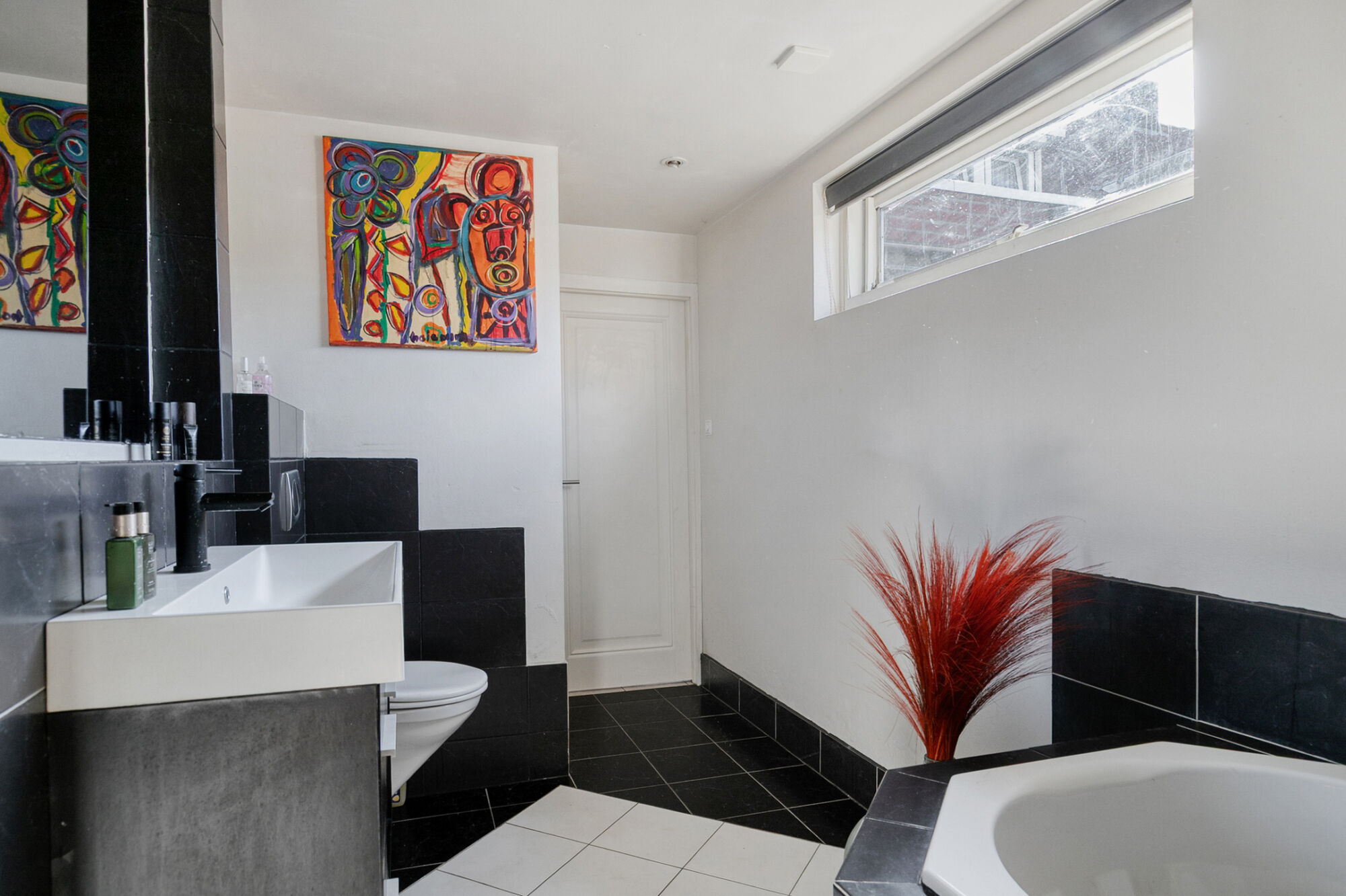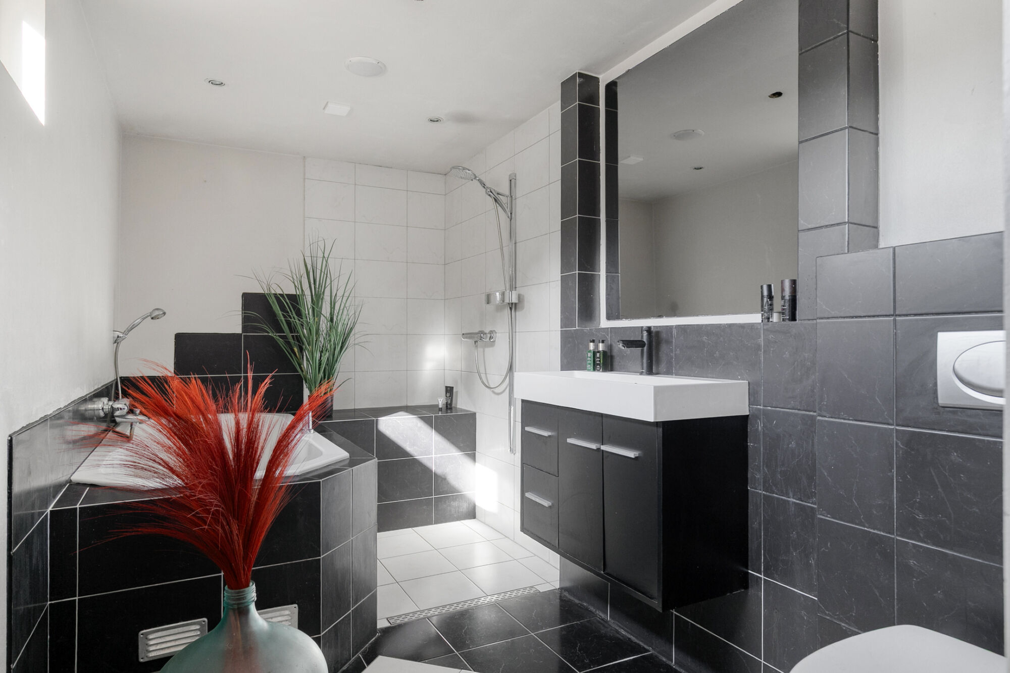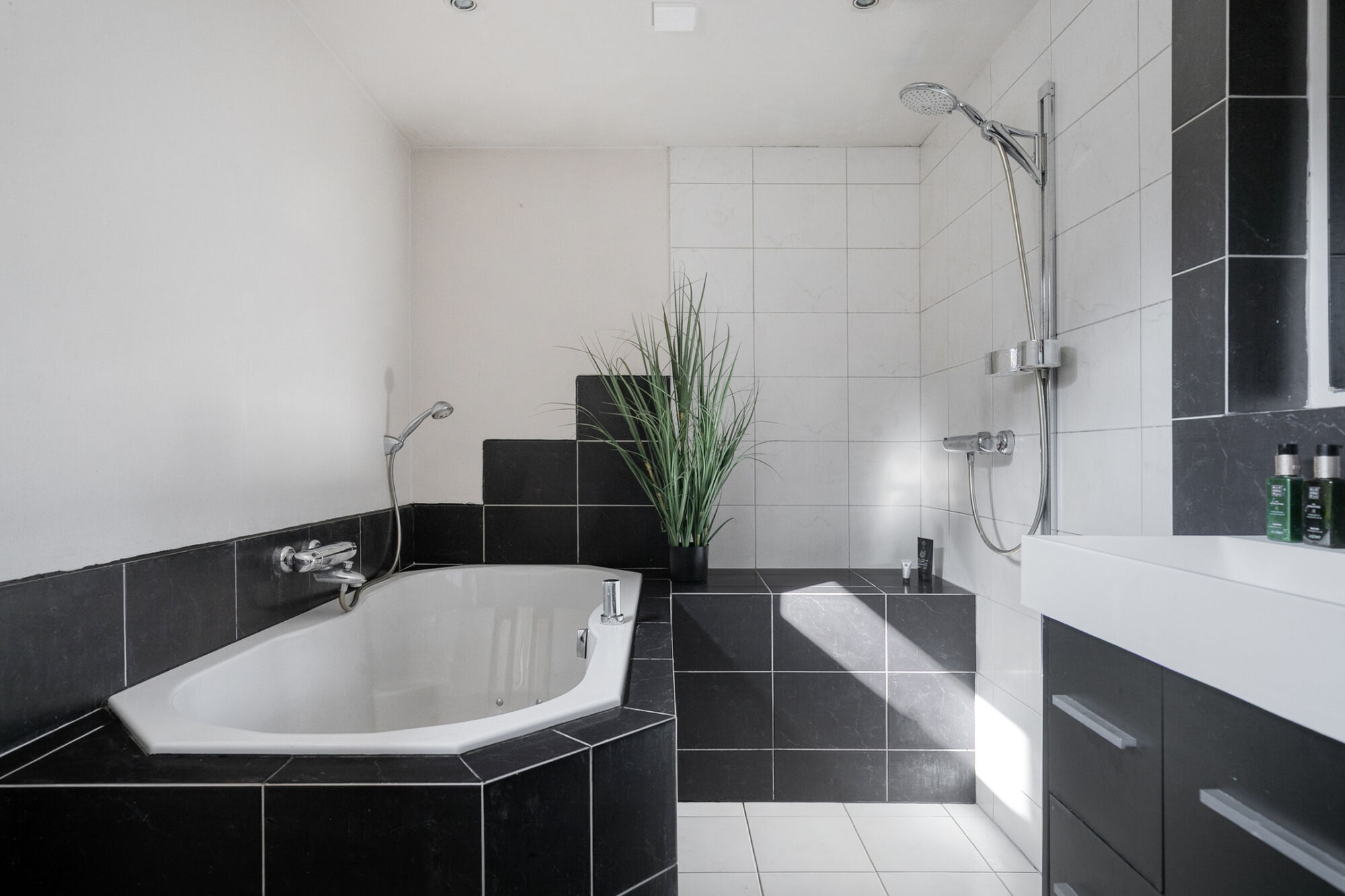Wat een heerlijk grote badkamer! Een mooie combinatie van witte en antracietkleurige landscape tegels. De badkamer is voorzien van een vloerverwarming. Zelfs het douchebankje is verwarmd. Je kunt heerlijk genieten in het ligbad met jacuzzi. Verder heb je een inloopdouche met een thermostaatkraan, een wastafel in meubel en een wandcloset.