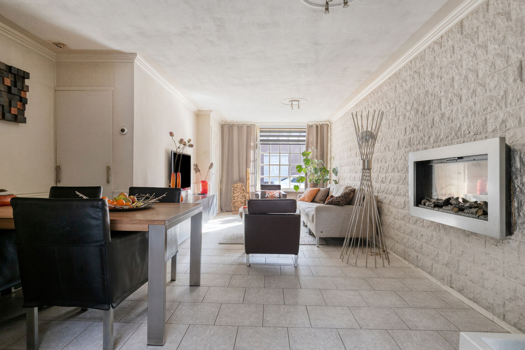 Vanwege de uitbouw krijg je een heel ruimtelijk effect in de woonkamer. Je kijkt helemaal door naar de achterzijde van het huis. Het raam aan de voorzijde zorgt voor veel lichtinval. Het is een sfeervolle ruimte met de mooie plafondlijsten, plafondranden en ornamenten. Een van de wanden is bezet met steenstrips. Op de verwarmde vloer ligt een vloertegel in een frisse, neutrale kleur. De woonkamer geeft toegang tot de trapkast met veel bergruimte. Hier hangt tevens de vernieuwde meterkast.