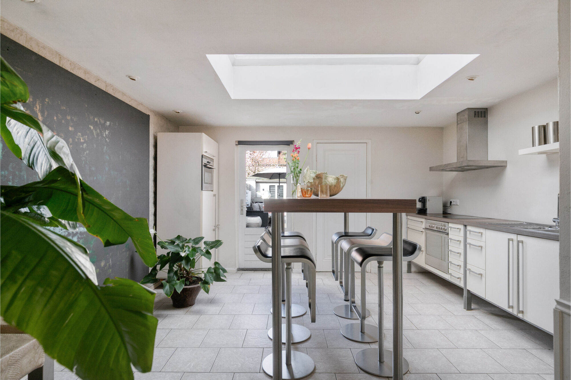 n de uitbouw is de moderne woonkeuken met strak gestucte wanden en plafond. Een heerlijk lichte ruimte vanwege de lichtkoepel. Er is meer dan genoeg ruimte voor een royale eettafel. De keuken biedt je volop werk- en bergruimte. Het is een mooie keuken met inbouwapparatuur zoals een grote oven en een keramische kookplaat met daarboven een strakke RVS schouw. In de andere wandopstelling is een koelkast en een combi-oven ingebouwd. Vanuit de keuken heb je toegang tot de tuin, de was-/stookruimte met de cv en een aansluiting voor de wasmachine en je loopt zo de badkamer in.