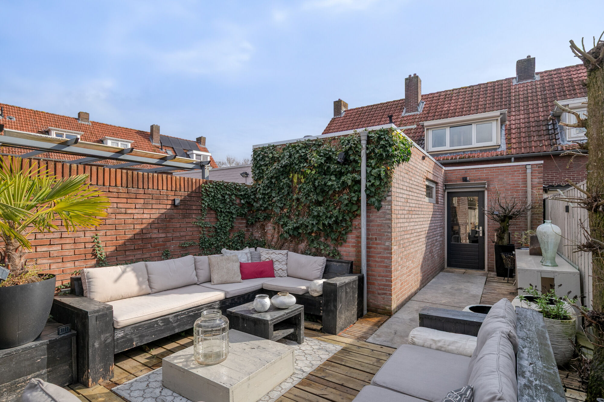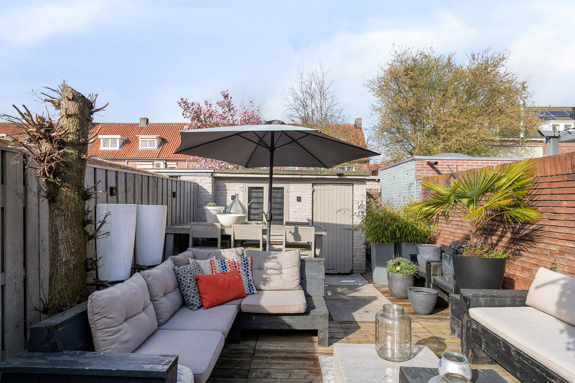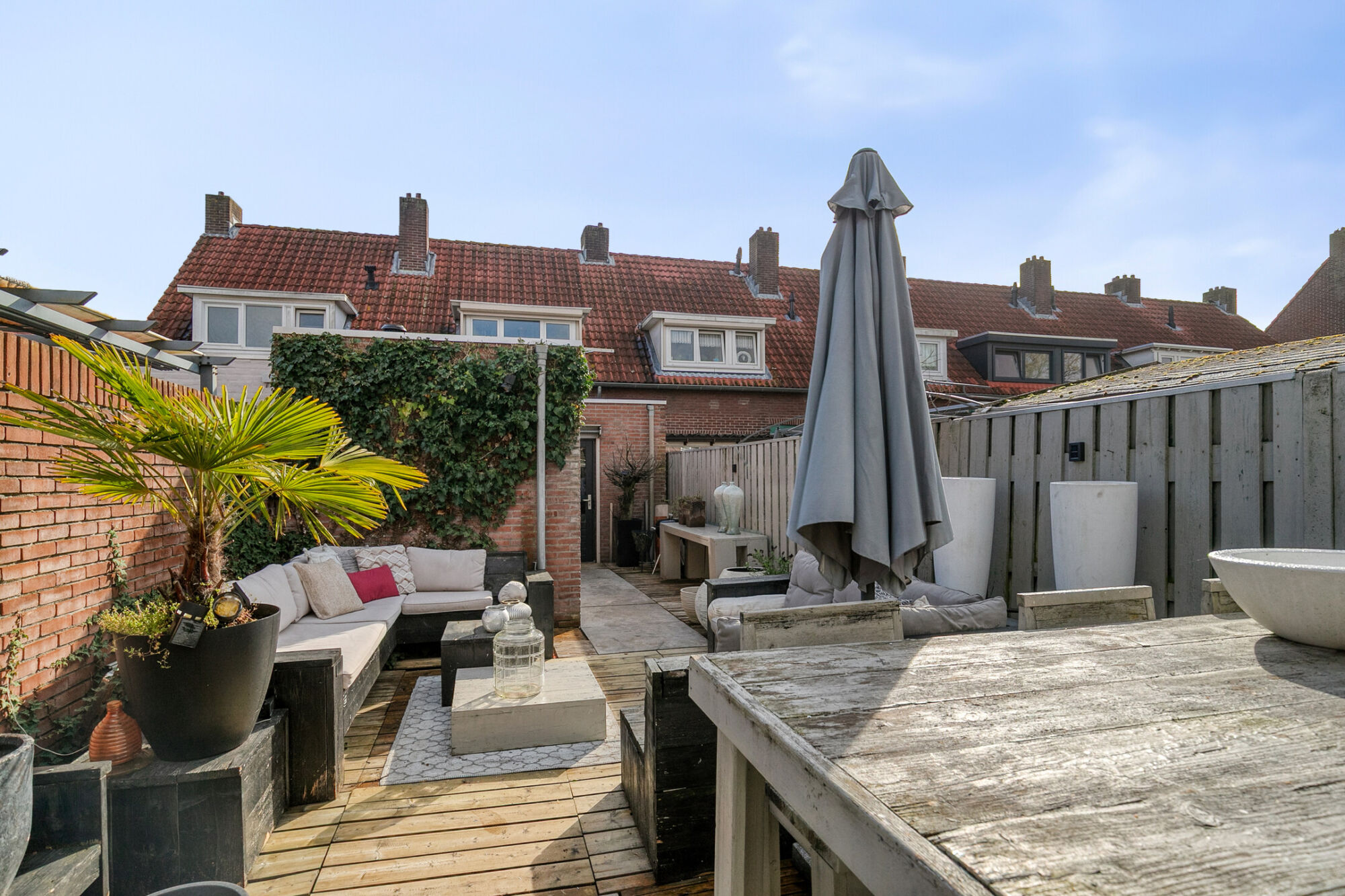 Heerlijk genieten in de zon in deze gezellig tuin. Hier worden houten vlonders afgewisseld met (terras)bestrating. De tuin biedt veel privacy en wordt geflankeerd door en stenen en een houten schutting. Achter in de tuin is een stenen berging met elektra. Een poort leidt je naar het pad achterom.