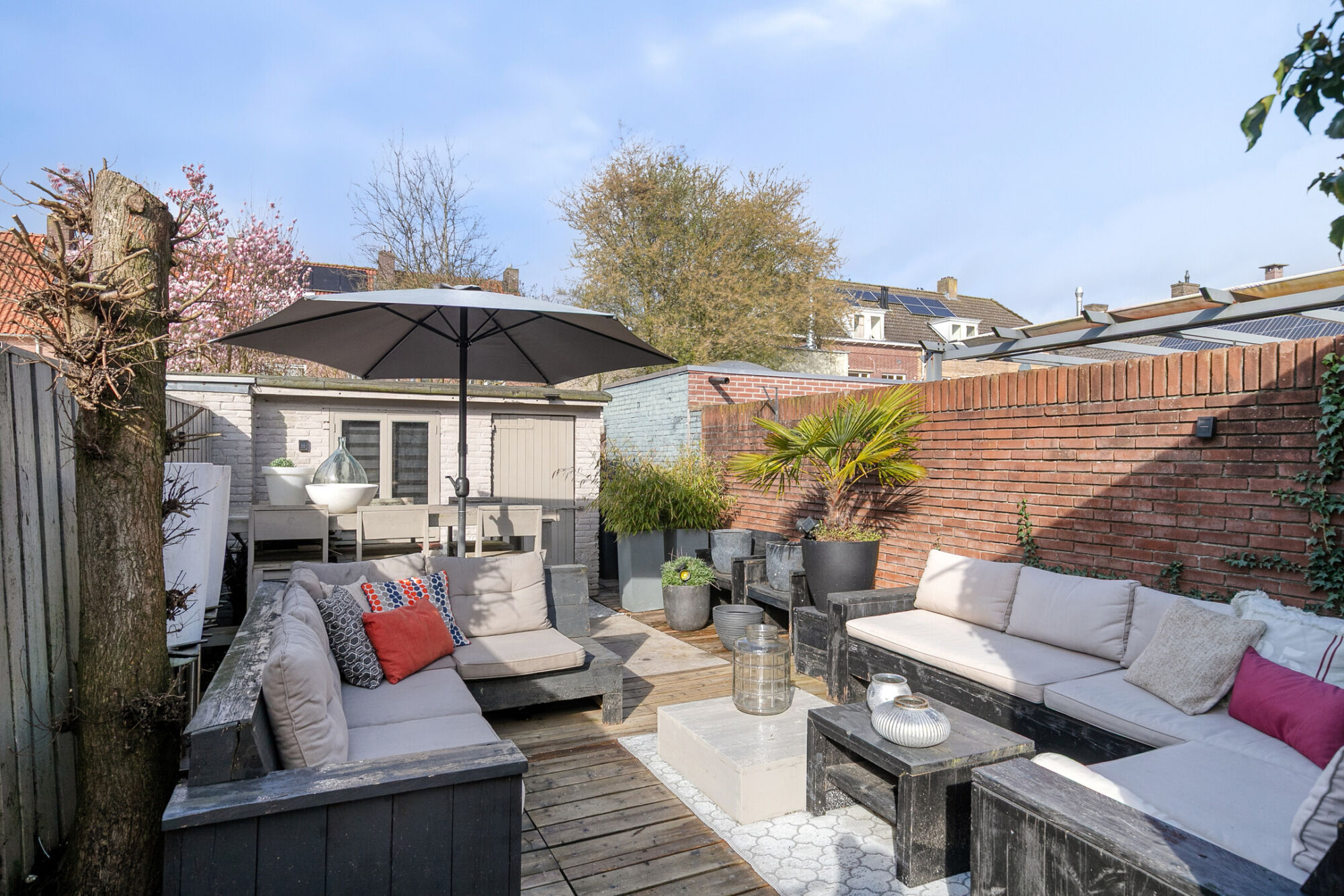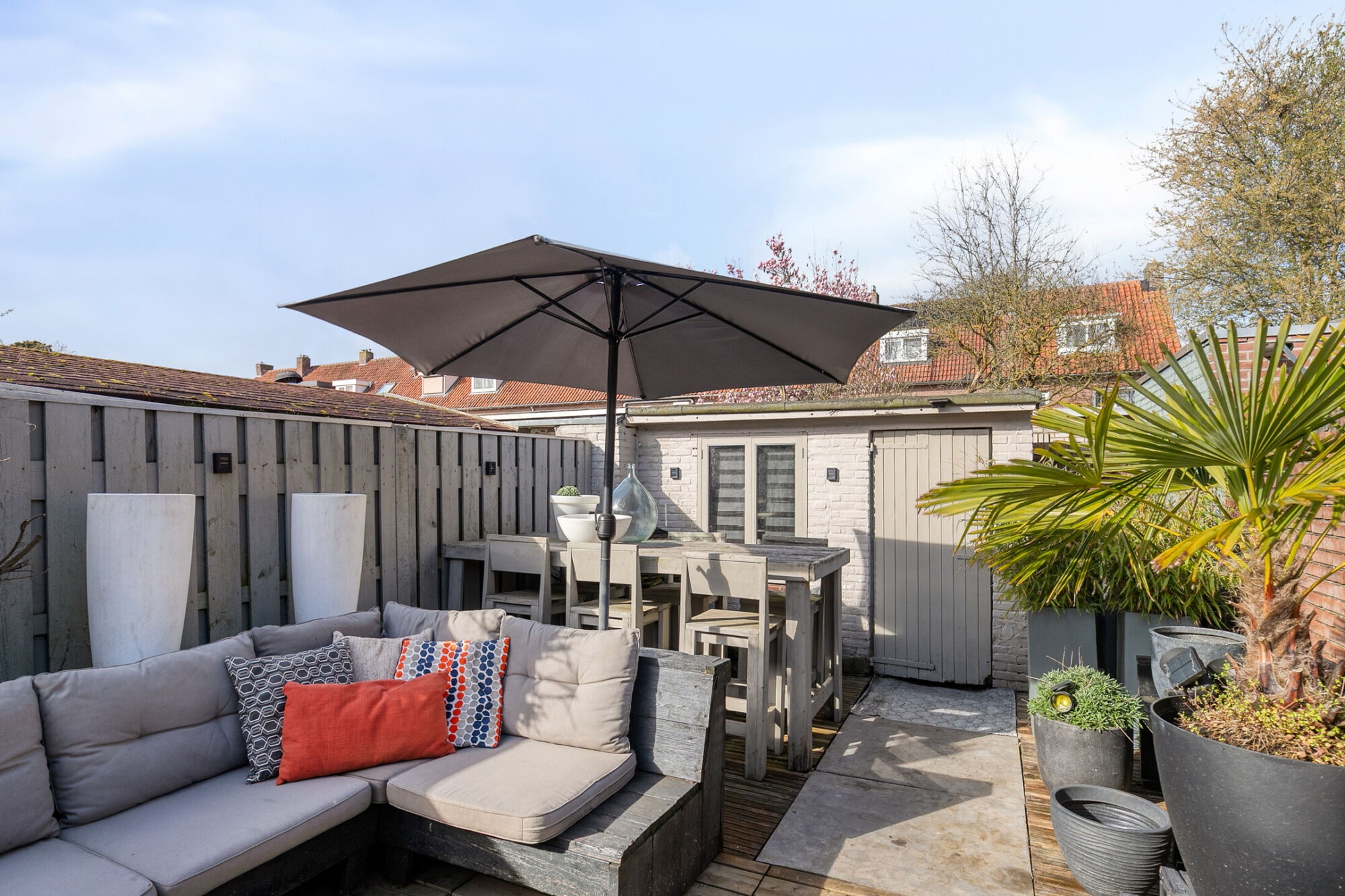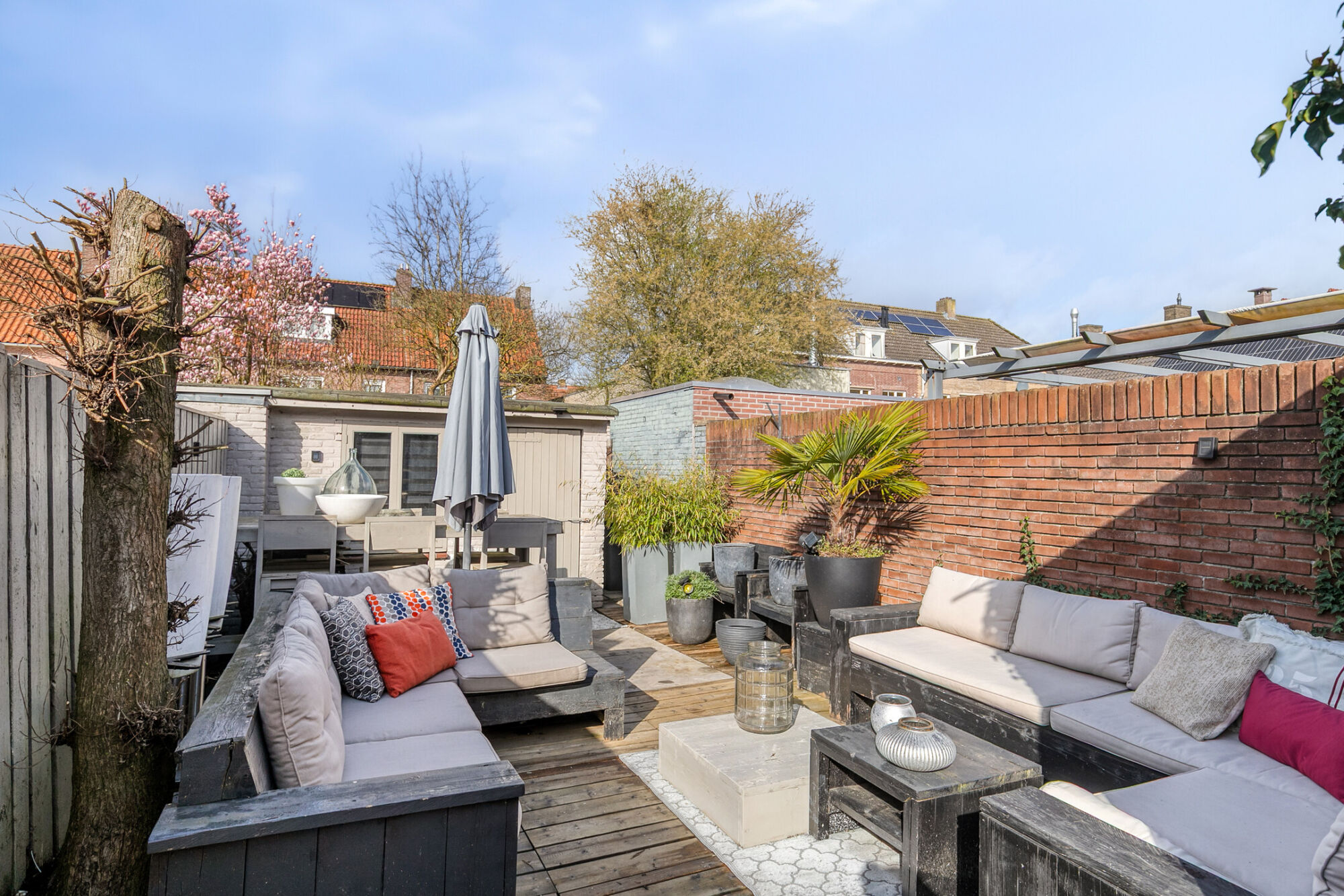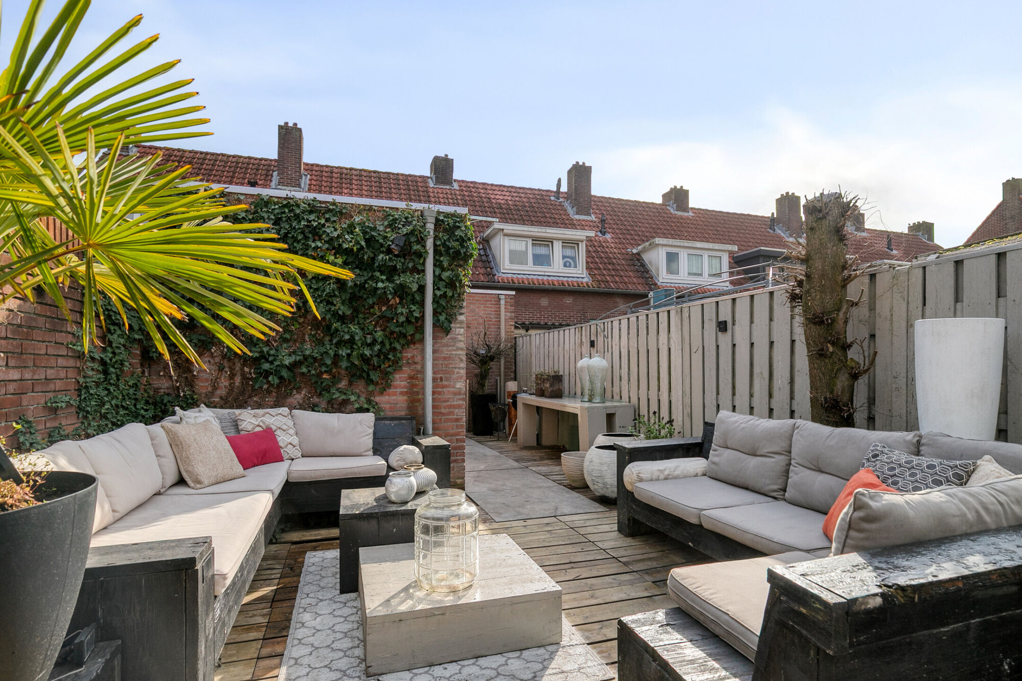 Heerlijk genieten in de zon in deze gezellig tuin. Hier worden houten vlonders afgewisseld met (terras)bestrating. De tuin biedt veel privacy en wordt geflankeerd door en stenen en een houten schutting. Achter in de tuin is een stenen berging met elektra. Een poort leidt je naar het pad achterom.